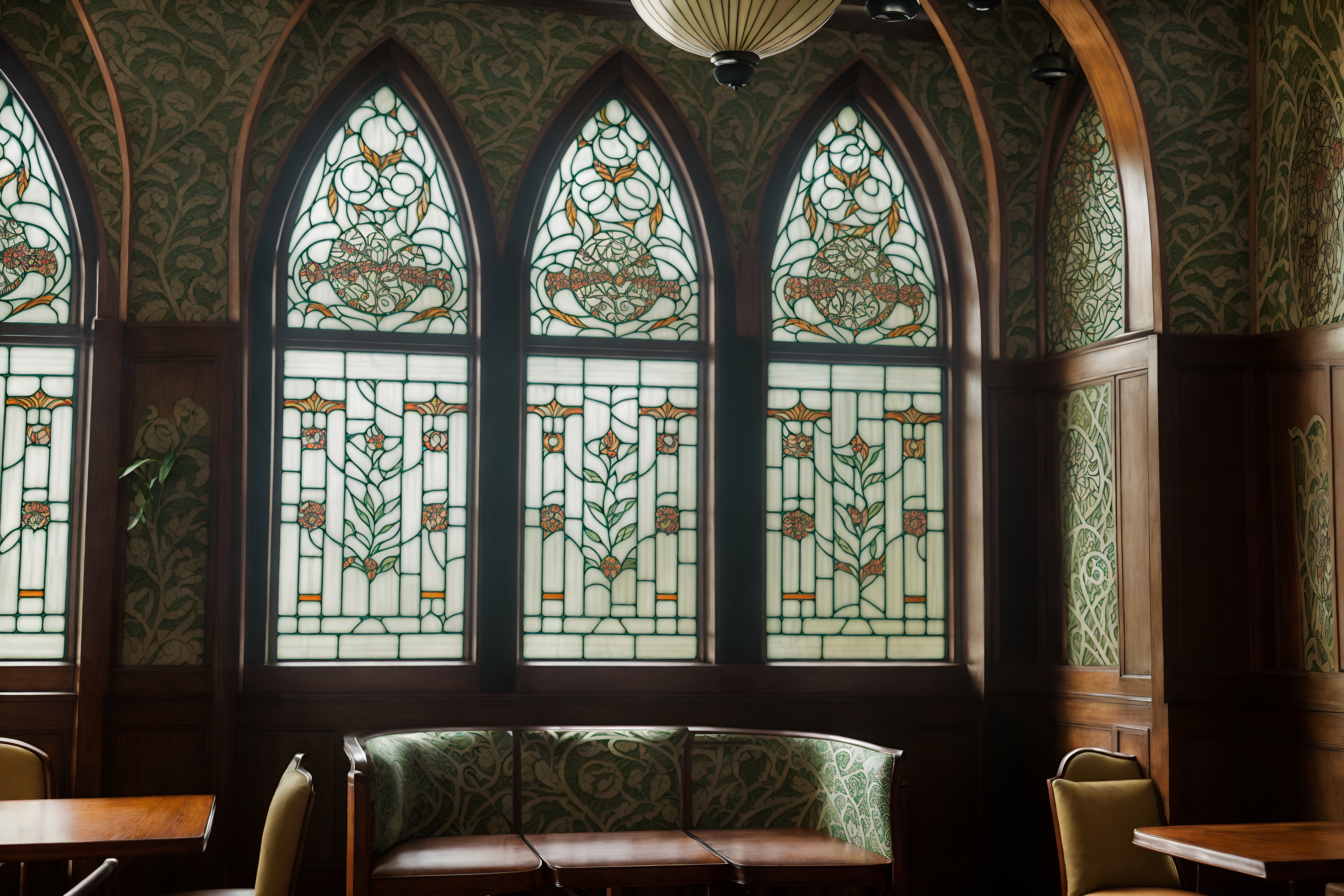 art nouveau coffee shopsinterior decorate this coffee shop with art nouveau style. . . . with curving, plant-like embellishments and mosaics and natural materials and stained glass and asymmetrical shapes and wallpaper patterns of stylized flowers and ashy colors and wallpaper pattners of spider webs. . .