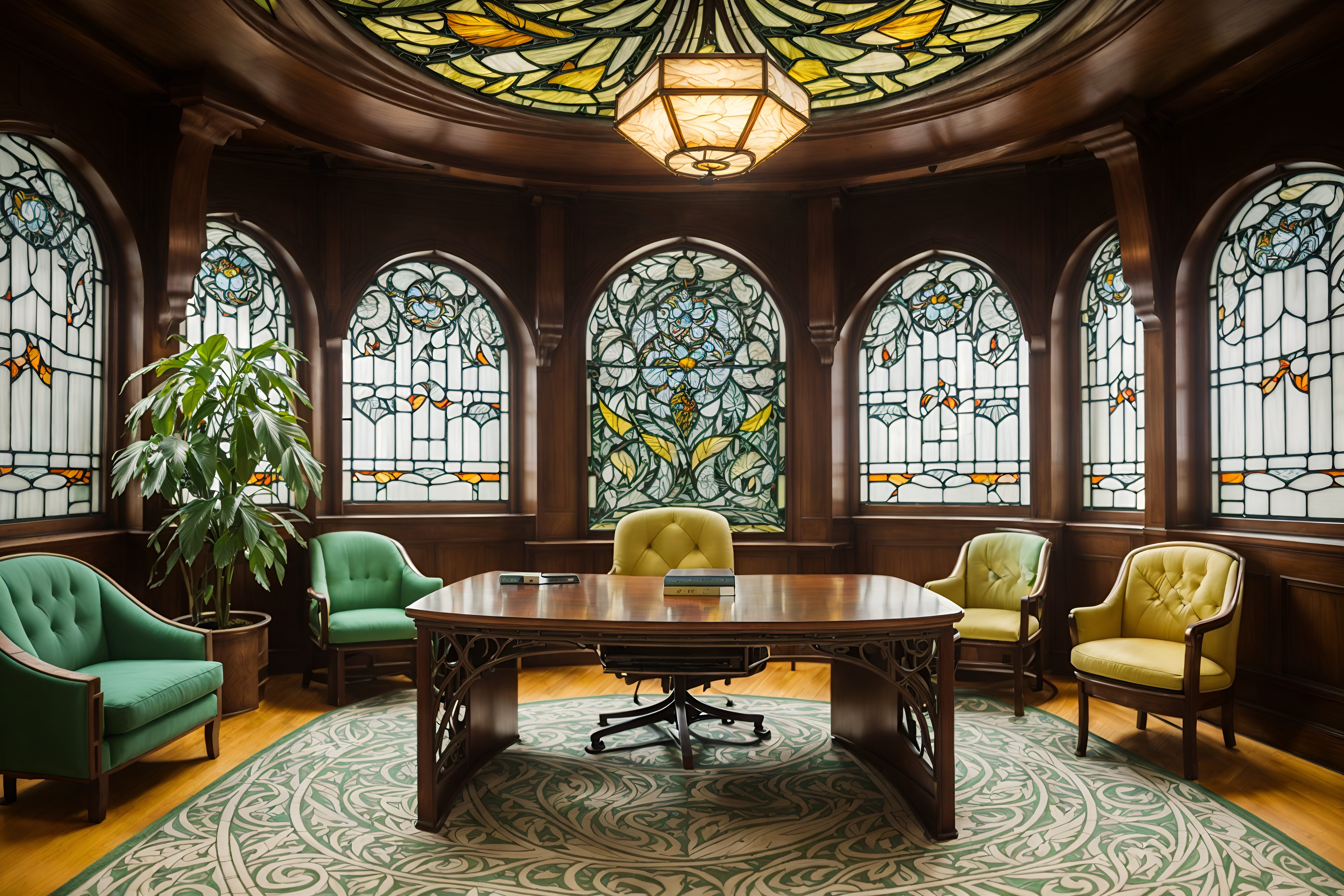 art nouveau coworking spacesinterior decorate this coworking space with art nouveau style. . . with office desks and seating area with sofa and lounge chairs and office chairs and office desks. . with wallpaper patterns of stylized flowers and stained glass and asymmetrical shapes and stained glass and arches and curved forms and wallpaper pattners of spider webs and mosaics and curved glass. . .