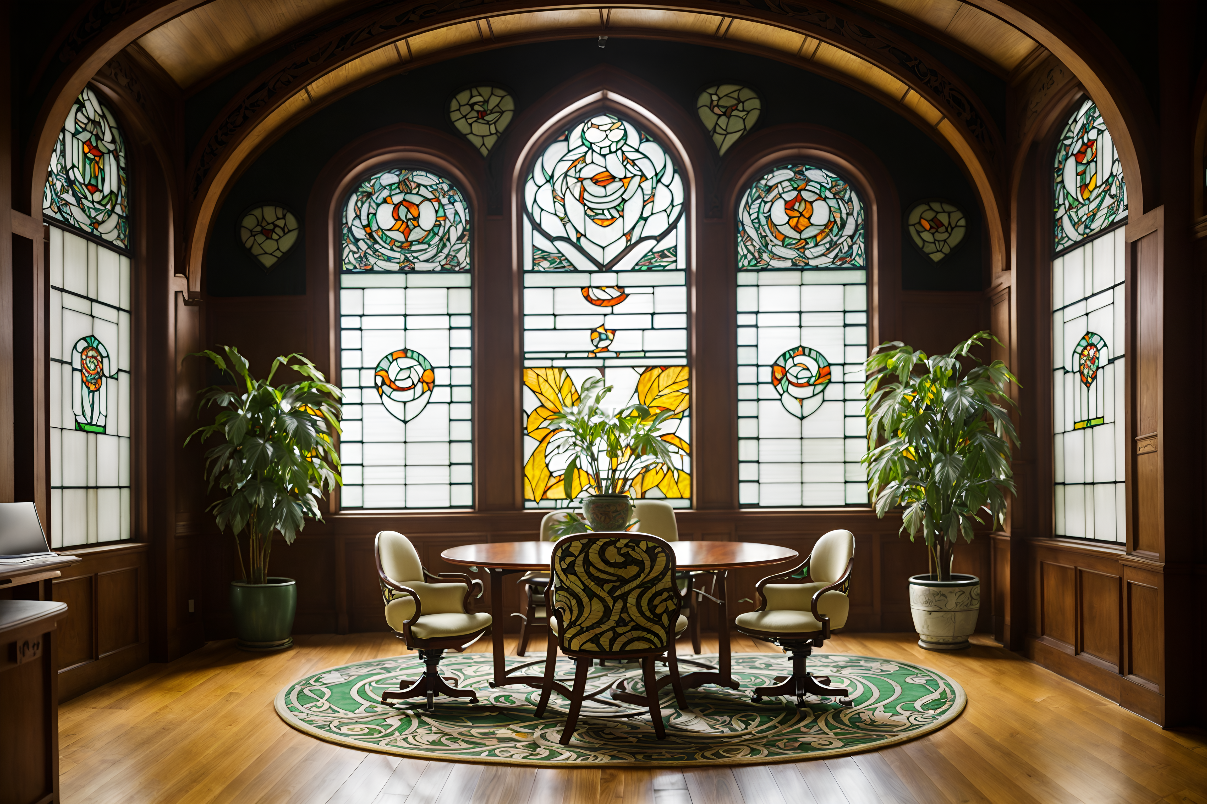 art nouveau coworking spacesinterior decorate this coworking space with art nouveau style. . . with office desks and seating area with sofa and lounge chairs and office chairs and office desks. . with wallpaper patterns of stylized flowers and stained glass and asymmetrical shapes and stained glass and arches and curved forms and wallpaper pattners of spider webs and mosaics and curved glass. . .