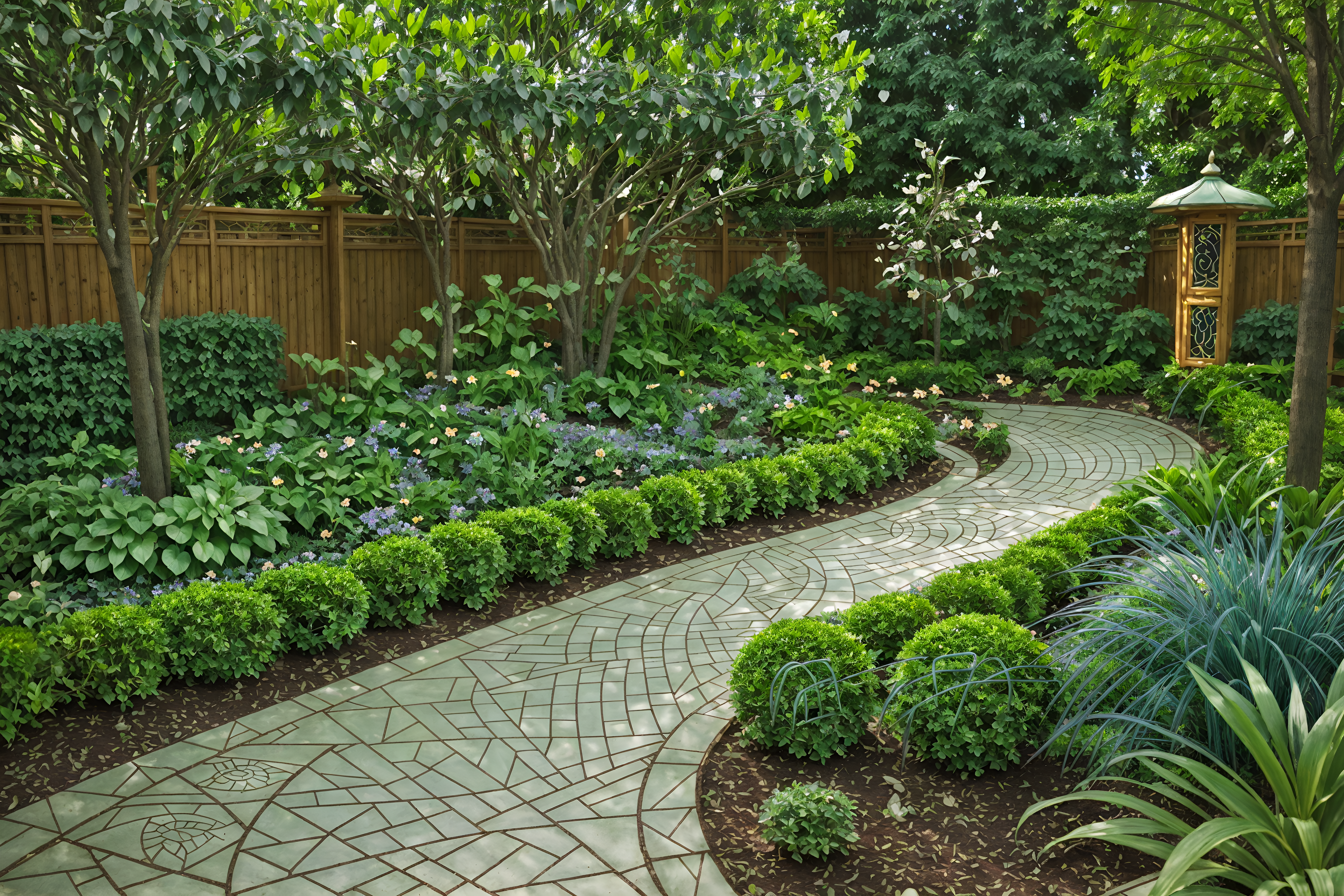 art nouveau outdoor gardensinterior decorate this outdoor garden with art nouveau style. . . with grass and garden tree and garden plants and grass. . with mosaics and wallpaper patterns of stylized flowers and wallpaper patterns of feathers and curved glass and natural materials and japanese motifs and arches and curved forms and asymmetrical shapes. . .