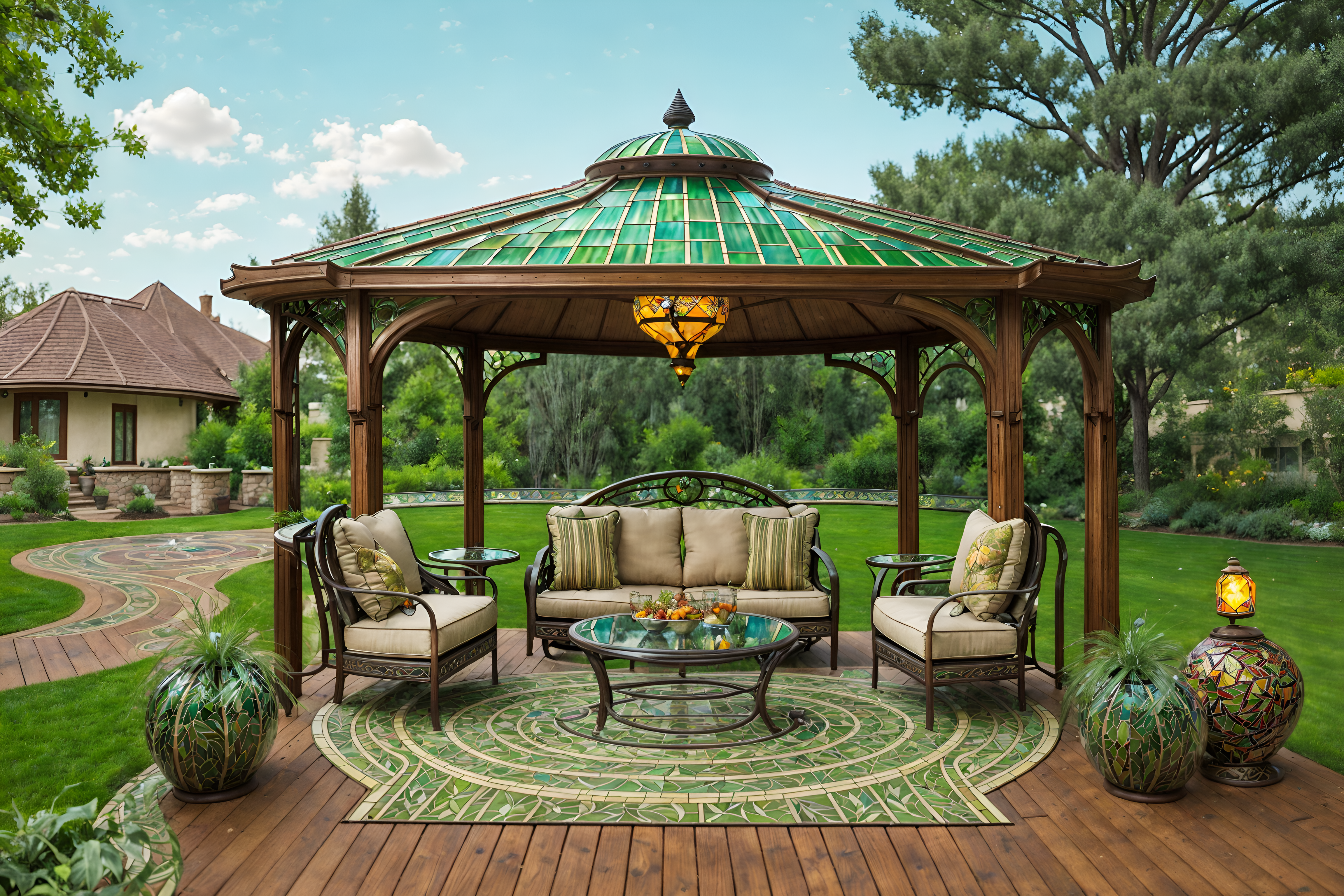 photo from pinterest of art nouveau-style designed (outdoor patio ) with grass and barbeque or grill and patio couch with pillows and deck with deck chairs and plant and grass. . with natural materials and stained glass and curved glass and mosaics and arches and curved forms and wallpaper pattners of spider webs and soft, rounded lines and stained glass. . cinematic photo, highly detailed, cinematic lighting, ultra-detailed, ultrarealistic, photorealism, 8k. trending on pinterest. art nouveau design style. masterpiece, cinematic light, ultrarealistic+, photorealistic+, 8k, raw photo, realistic, sharp focus on eyes, (symmetrical eyes), (intact eyes), hyperrealistic, highest quality, best quality, , highly detailed, masterpiece, best quality, extremely detailed 8k wallpaper, masterpiece, best quality, ultra-detailed, best shadow, detailed background, detailed face, detailed eyes, high contrast, best illumination, detailed face, dulux, caustic, dynamic angle, detailed glow. dramatic lighting. highly detailed, insanely detailed hair, symmetrical, intricate details, professionally retouched, 8k high definition. strong bokeh. award winning photo.