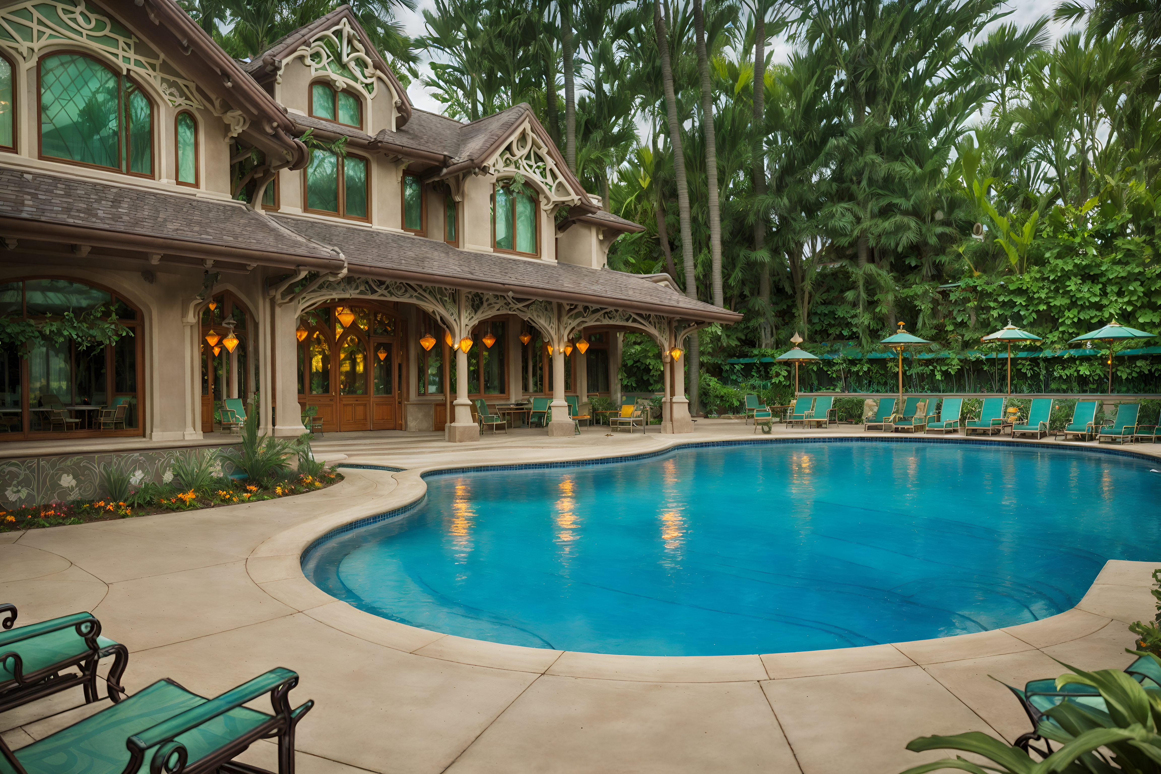 photo from pinterest of art nouveau-style designed (outdoor pool area ) with pool lights and pool and pool lounge chairs and pool lights. . with stained glass and curving, plant-like embellishments and wallpaper pattners of spider webs and soft, rounded lines and stained glass and arches and curved forms and natural materials and wallpaper patterns of stylized flowers. . cinematic photo, highly detailed, cinematic lighting, ultra-detailed, ultrarealistic, photorealism, 8k. trending on pinterest. art nouveau design style. masterpiece, cinematic light, ultrarealistic+, photorealistic+, 8k, raw photo, realistic, sharp focus on eyes, (symmetrical eyes), (intact eyes), hyperrealistic, highest quality, best quality, , highly detailed, masterpiece, best quality, extremely detailed 8k wallpaper, masterpiece, best quality, ultra-detailed, best shadow, detailed background, detailed face, detailed eyes, high contrast, best illumination, detailed face, dulux, caustic, dynamic angle, detailed glow. dramatic lighting. highly detailed, insanely detailed hair, symmetrical, intricate details, professionally retouched, 8k high definition. strong bokeh. award winning photo.