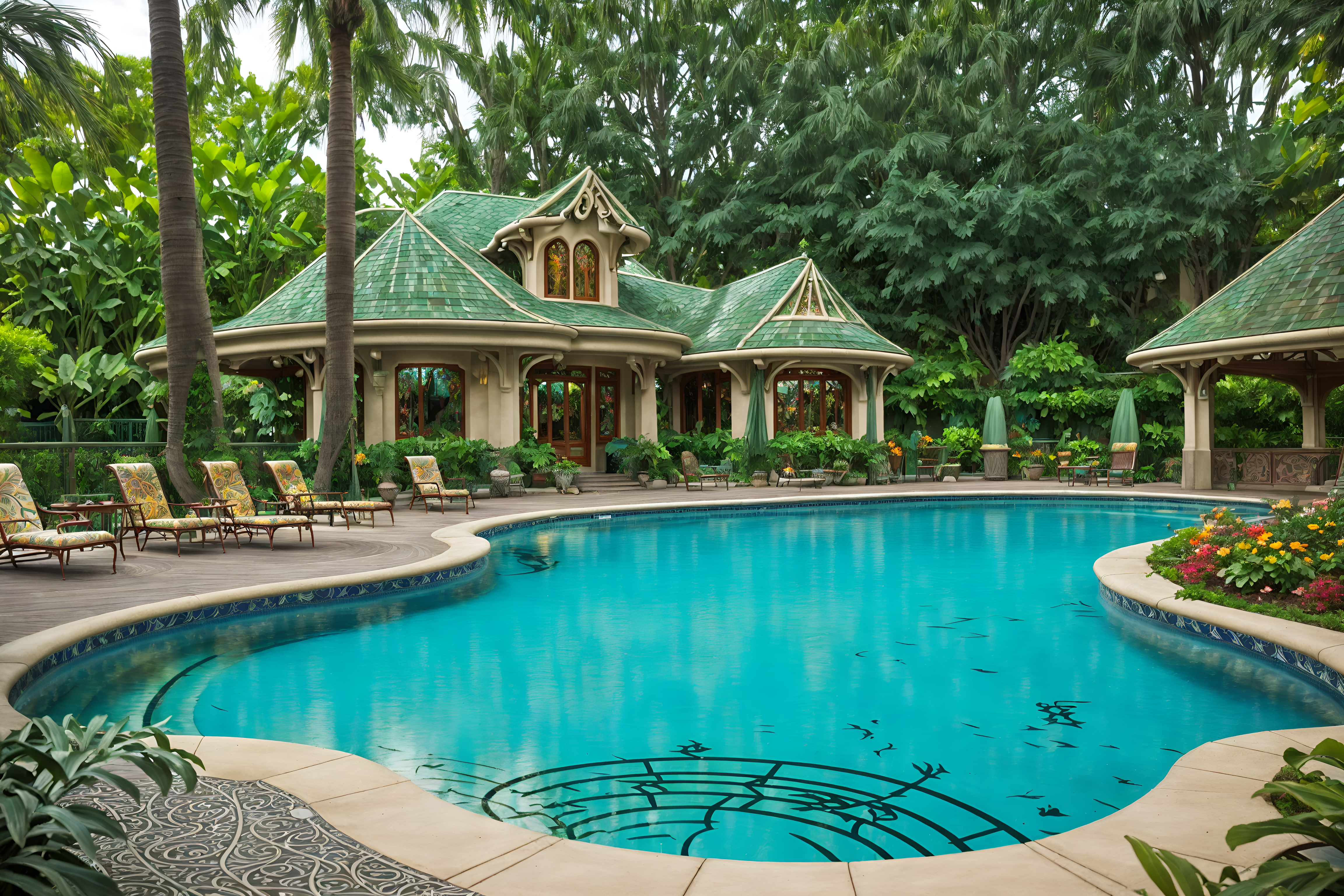 photo from pinterest of art nouveau-style designed (outdoor pool area ) with pool lights and pool and pool lounge chairs and pool lights. . with stained glass and curving, plant-like embellishments and wallpaper pattners of spider webs and soft, rounded lines and stained glass and arches and curved forms and natural materials and wallpaper patterns of stylized flowers. . cinematic photo, highly detailed, cinematic lighting, ultra-detailed, ultrarealistic, photorealism, 8k. trending on pinterest. art nouveau design style. masterpiece, cinematic light, ultrarealistic+, photorealistic+, 8k, raw photo, realistic, sharp focus on eyes, (symmetrical eyes), (intact eyes), hyperrealistic, highest quality, best quality, , highly detailed, masterpiece, best quality, extremely detailed 8k wallpaper, masterpiece, best quality, ultra-detailed, best shadow, detailed background, detailed face, detailed eyes, high contrast, best illumination, detailed face, dulux, caustic, dynamic angle, detailed glow. dramatic lighting. highly detailed, insanely detailed hair, symmetrical, intricate details, professionally retouched, 8k high definition. strong bokeh. award winning photo.