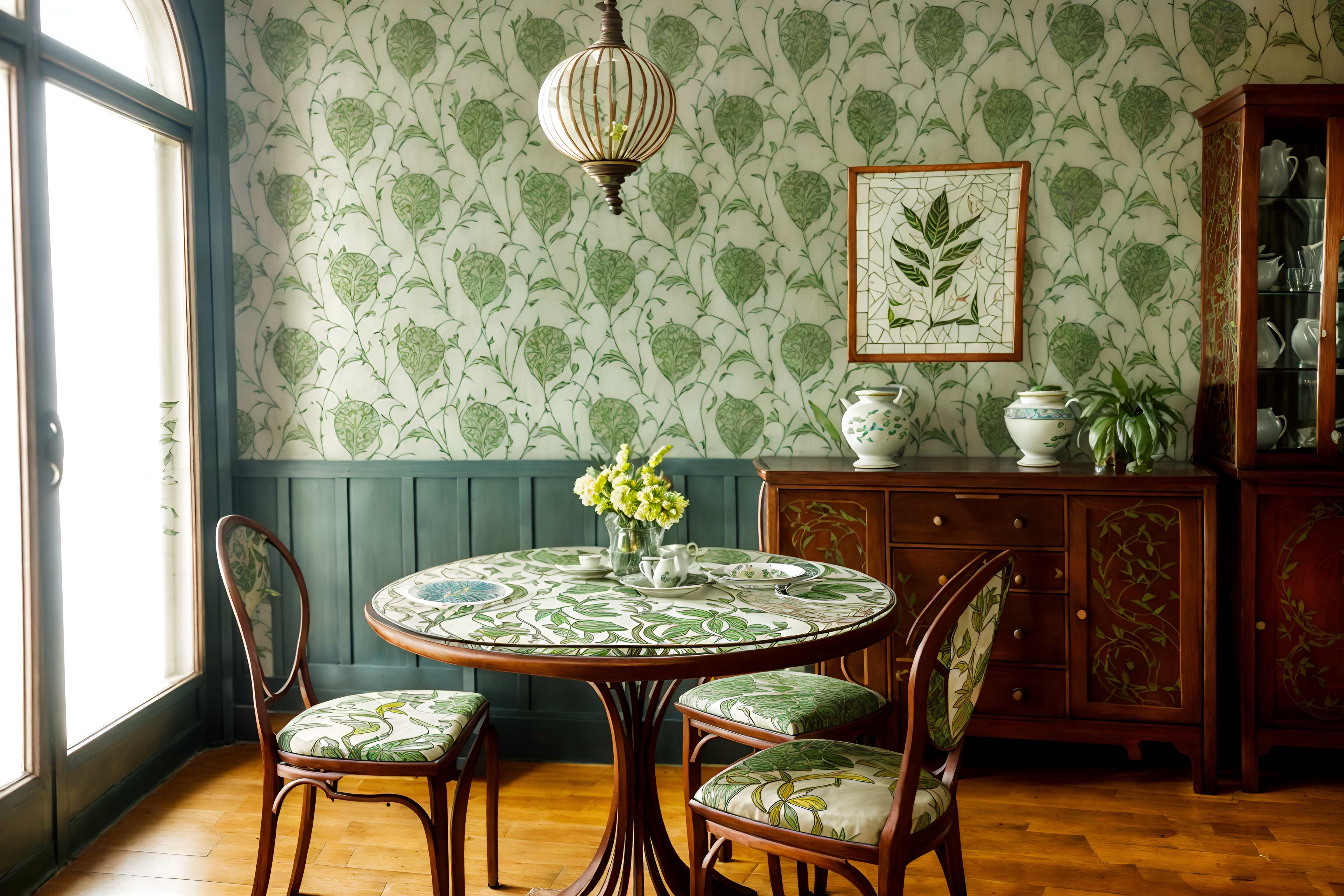 photo from pinterest of art nouveau-style interior designed (dining room interior) with plant and dining table chairs and plates, cutlery and glasses on dining table and table cloth and painting or photo on wall and vase and bookshelves and dining table. . with soft, rounded lines and wallpaper patterns of feathers and mosaics and japanese motifs and stained glass and curved glass and wallpaper patterns of stylized flowers and natural materials. . cinematic photo, highly detailed, cinematic lighting, ultra-detailed, ultrarealistic, photorealism, 8k. trending on pinterest. art nouveau interior design style. masterpiece, cinematic light, ultrarealistic+, photorealistic+, 8k, raw photo, realistic, sharp focus on eyes, (symmetrical eyes), (intact eyes), hyperrealistic, highest quality, best quality, , highly detailed, masterpiece, best quality, extremely detailed 8k wallpaper, masterpiece, best quality, ultra-detailed, best shadow, detailed background, detailed face, detailed eyes, high contrast, best illumination, detailed face, dulux, caustic, dynamic angle, detailed glow. dramatic lighting. highly detailed, insanely detailed hair, symmetrical, intricate details, professionally retouched, 8k high definition. strong bokeh. award winning photo.