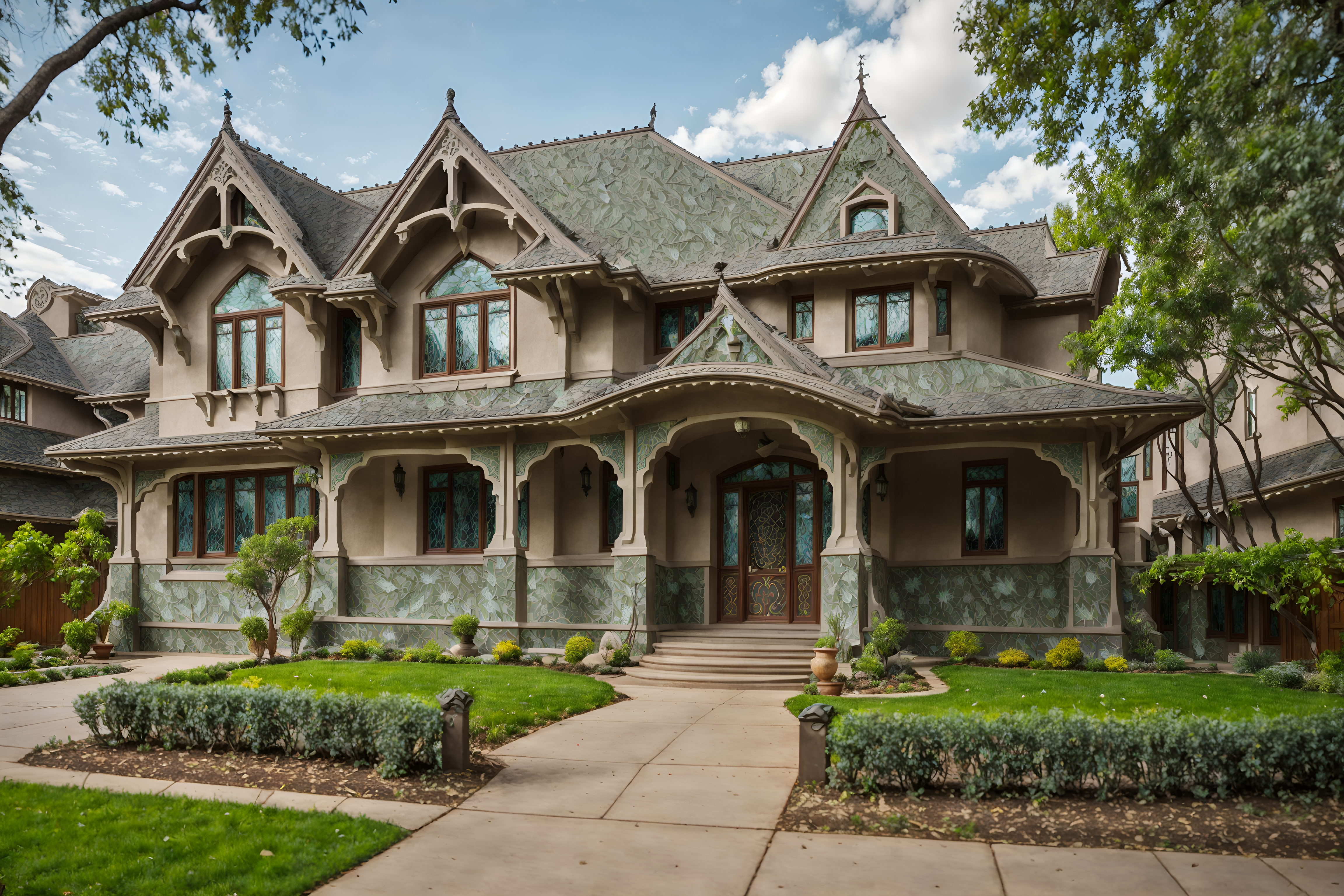 photo from pinterest of art nouveau-style exterior designed (house exterior exterior) . with ashy colors and wallpaper patterns of feathers and curving, plant-like embellishments and asymmetrical shapes and arches and curved forms and mosaics and natural materials and stained glass. . cinematic photo, highly detailed, cinematic lighting, ultra-detailed, ultrarealistic, photorealism, 8k. trending on pinterest. art nouveau exterior design style. masterpiece, cinematic light, ultrarealistic+, photorealistic+, 8k, raw photo, realistic, sharp focus on eyes, (symmetrical eyes), (intact eyes), hyperrealistic, highest quality, best quality, , highly detailed, masterpiece, best quality, extremely detailed 8k wallpaper, masterpiece, best quality, ultra-detailed, best shadow, detailed background, detailed face, detailed eyes, high contrast, best illumination, detailed face, dulux, caustic, dynamic angle, detailed glow. dramatic lighting. highly detailed, insanely detailed hair, symmetrical, intricate details, professionally retouched, 8k high definition. strong bokeh. award winning photo.