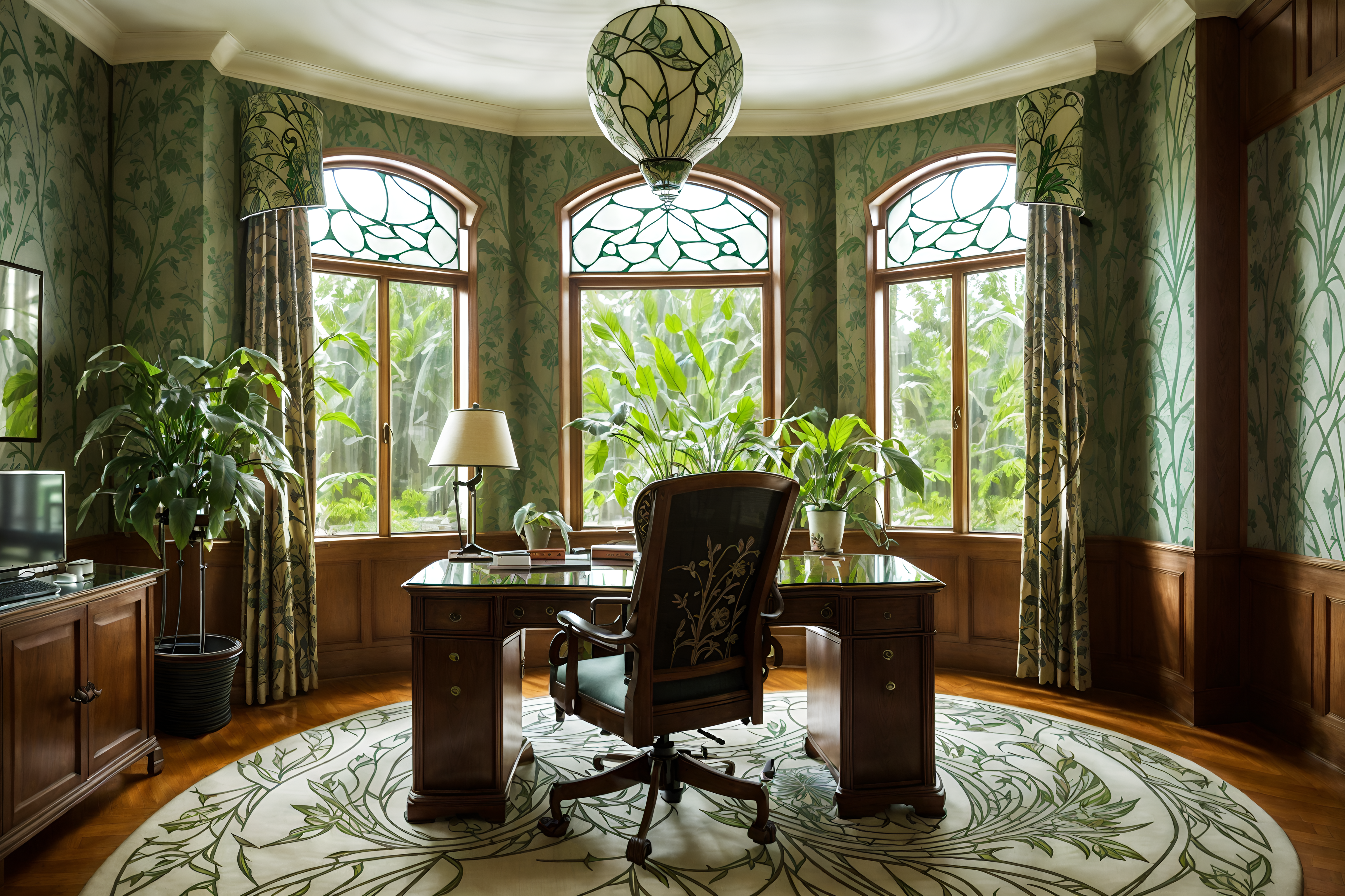photo from pinterest of art nouveau-style interior designed (home office interior) with office chair and computer desk and plant and desk lamp and cabinets and office chair. . with wallpaper patterns of stylized flowers and wallpaper patterns of feathers and asymmetrical shapes and curved glass and soft, rounded lines and arches and curved forms and wallpaper pattners of spider webs and stained glass. . cinematic photo, highly detailed, cinematic lighting, ultra-detailed, ultrarealistic, photorealism, 8k. trending on pinterest. art nouveau interior design style. masterpiece, cinematic light, ultrarealistic+, photorealistic+, 8k, raw photo, realistic, sharp focus on eyes, (symmetrical eyes), (intact eyes), hyperrealistic, highest quality, best quality, , highly detailed, masterpiece, best quality, extremely detailed 8k wallpaper, masterpiece, best quality, ultra-detailed, best shadow, detailed background, detailed face, detailed eyes, high contrast, best illumination, detailed face, dulux, caustic, dynamic angle, detailed glow. dramatic lighting. highly detailed, insanely detailed hair, symmetrical, intricate details, professionally retouched, 8k high definition. strong bokeh. award winning photo.