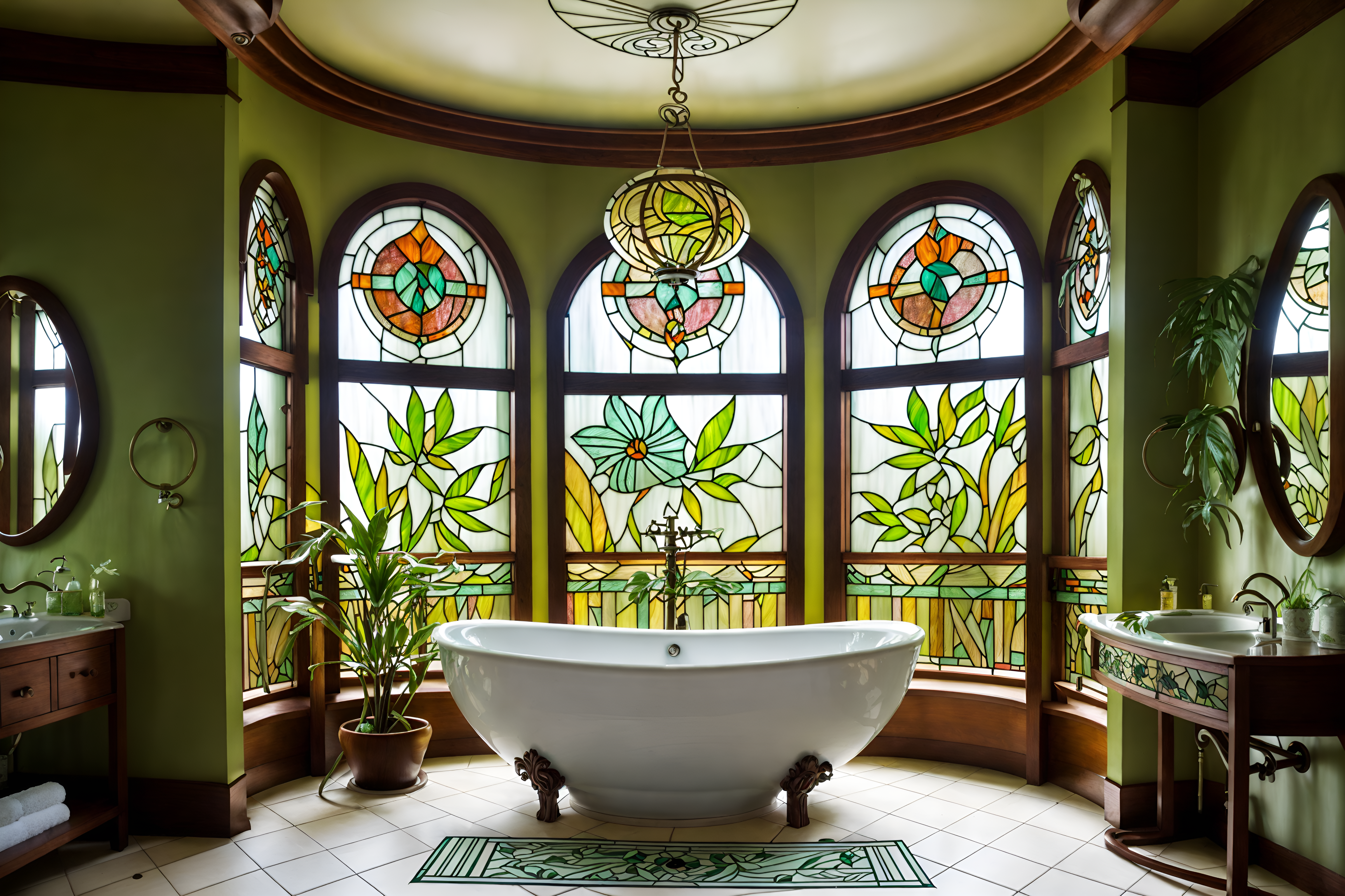 photo from pinterest of art nouveau-style interior designed (hotel bathroom interior) with shower and bath towel and plant and bathroom sink with faucet and bathtub and bath rail and toilet seat and waste basket. . with stained glass and curving, plant-like embellishments and arches and curved forms and wallpaper pattners of spider webs and natural materials and curved glass and stained glass and japanese motifs. . cinematic photo, highly detailed, cinematic lighting, ultra-detailed, ultrarealistic, photorealism, 8k. trending on pinterest. art nouveau interior design style. masterpiece, cinematic light, ultrarealistic+, photorealistic+, 8k, raw photo, realistic, sharp focus on eyes, (symmetrical eyes), (intact eyes), hyperrealistic, highest quality, best quality, , highly detailed, masterpiece, best quality, extremely detailed 8k wallpaper, masterpiece, best quality, ultra-detailed, best shadow, detailed background, detailed face, detailed eyes, high contrast, best illumination, detailed face, dulux, caustic, dynamic angle, detailed glow. dramatic lighting. highly detailed, insanely detailed hair, symmetrical, intricate details, professionally retouched, 8k high definition. strong bokeh. award winning photo.