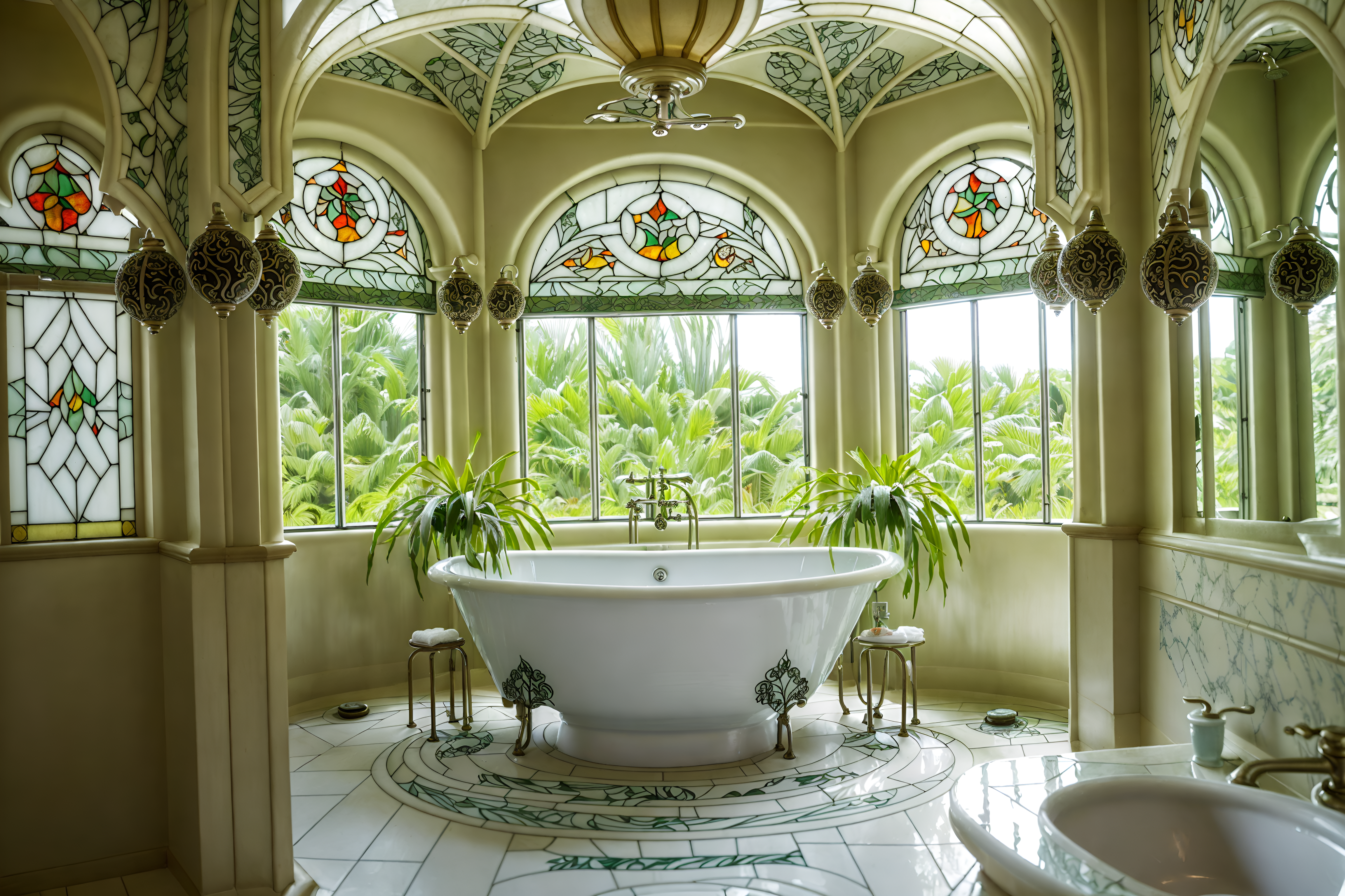 photo from pinterest of art nouveau-style interior designed (hotel bathroom interior) with shower and bath towel and plant and bathroom sink with faucet and bathtub and bath rail and toilet seat and waste basket. . with stained glass and curving, plant-like embellishments and arches and curved forms and wallpaper pattners of spider webs and natural materials and curved glass and stained glass and japanese motifs. . cinematic photo, highly detailed, cinematic lighting, ultra-detailed, ultrarealistic, photorealism, 8k. trending on pinterest. art nouveau interior design style. masterpiece, cinematic light, ultrarealistic+, photorealistic+, 8k, raw photo, realistic, sharp focus on eyes, (symmetrical eyes), (intact eyes), hyperrealistic, highest quality, best quality, , highly detailed, masterpiece, best quality, extremely detailed 8k wallpaper, masterpiece, best quality, ultra-detailed, best shadow, detailed background, detailed face, detailed eyes, high contrast, best illumination, detailed face, dulux, caustic, dynamic angle, detailed glow. dramatic lighting. highly detailed, insanely detailed hair, symmetrical, intricate details, professionally retouched, 8k high definition. strong bokeh. award winning photo.