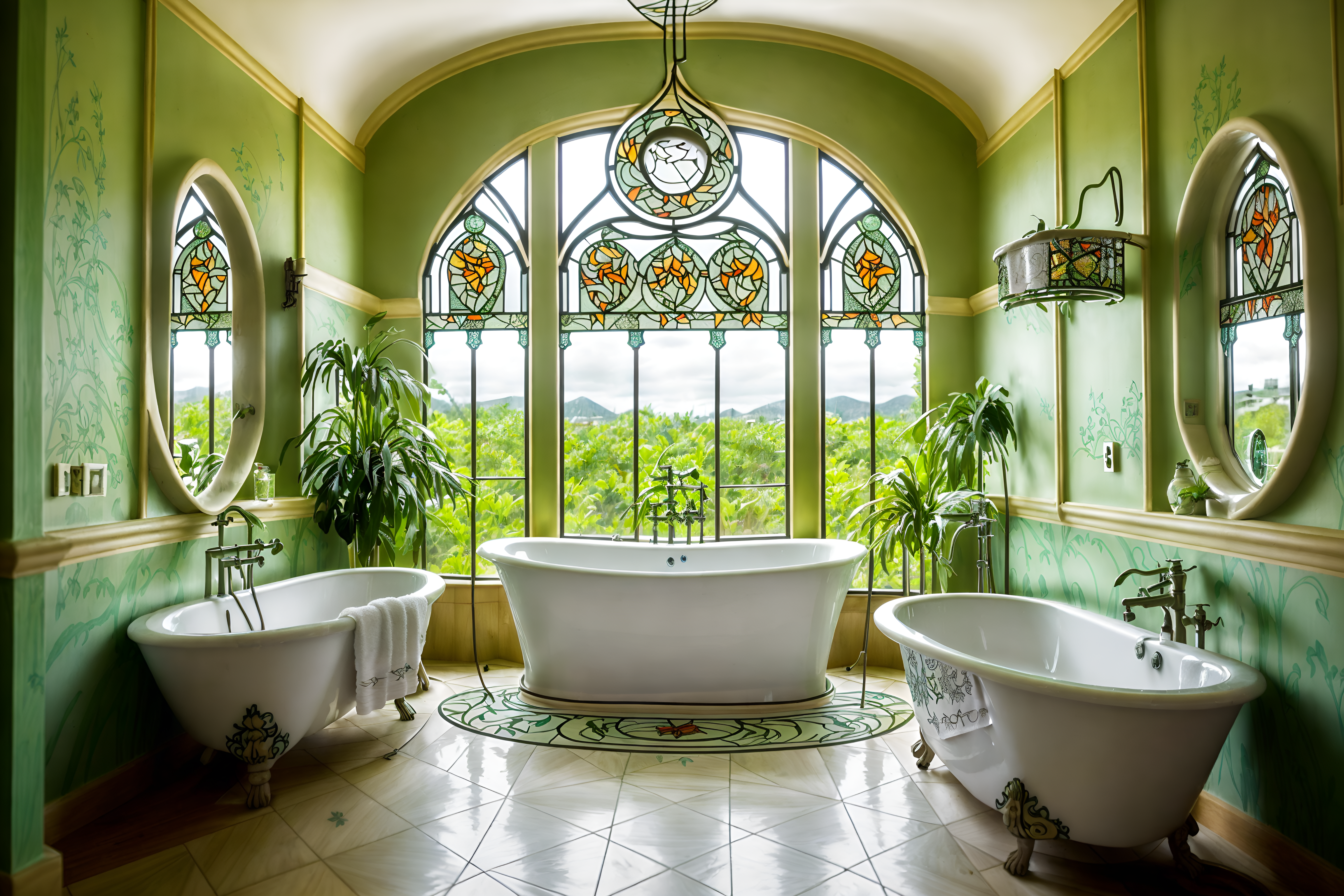 photo from pinterest of art nouveau-style interior designed (hotel bathroom interior) with shower and bath towel and plant and bathroom sink with faucet and bathtub and bath rail and toilet seat and waste basket. . with stained glass and curving, plant-like embellishments and arches and curved forms and wallpaper pattners of spider webs and natural materials and curved glass and stained glass and japanese motifs. . cinematic photo, highly detailed, cinematic lighting, ultra-detailed, ultrarealistic, photorealism, 8k. trending on pinterest. art nouveau interior design style. masterpiece, cinematic light, ultrarealistic+, photorealistic+, 8k, raw photo, realistic, sharp focus on eyes, (symmetrical eyes), (intact eyes), hyperrealistic, highest quality, best quality, , highly detailed, masterpiece, best quality, extremely detailed 8k wallpaper, masterpiece, best quality, ultra-detailed, best shadow, detailed background, detailed face, detailed eyes, high contrast, best illumination, detailed face, dulux, caustic, dynamic angle, detailed glow. dramatic lighting. highly detailed, insanely detailed hair, symmetrical, intricate details, professionally retouched, 8k high definition. strong bokeh. award winning photo.