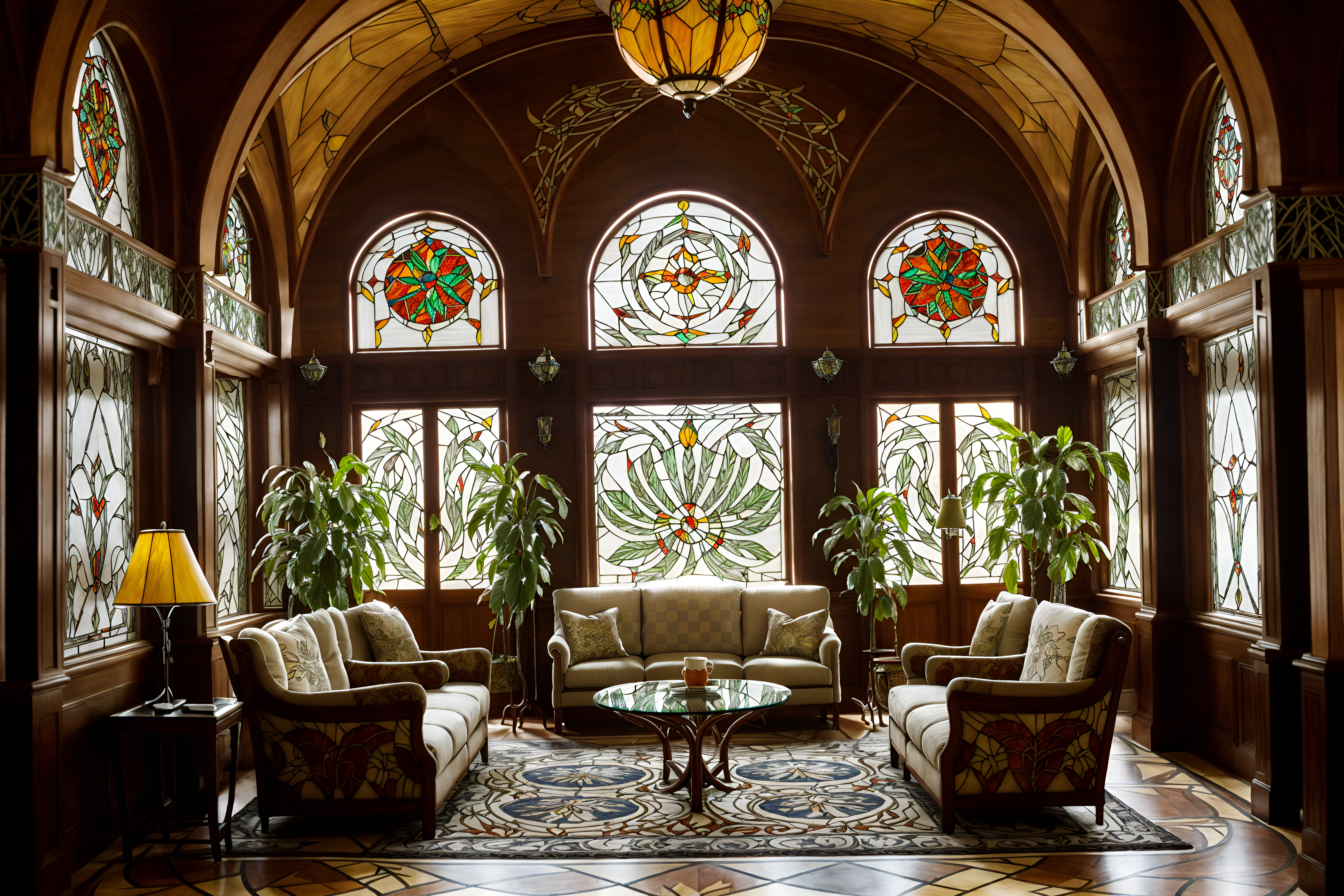 art nouveau hotel lobbysinterior decorate this hotel lobby with art nouveau style. . . with lounge chairs and rug and sofas and furniture and hanging lamps and plant and coffee tables and check in desk. . with stained glass and ashy colors and wallpaper pattners of spider webs and mosaics and asymmetrical shapes and curving, plant-like embellishments and japanese motifs and curved glass. . .