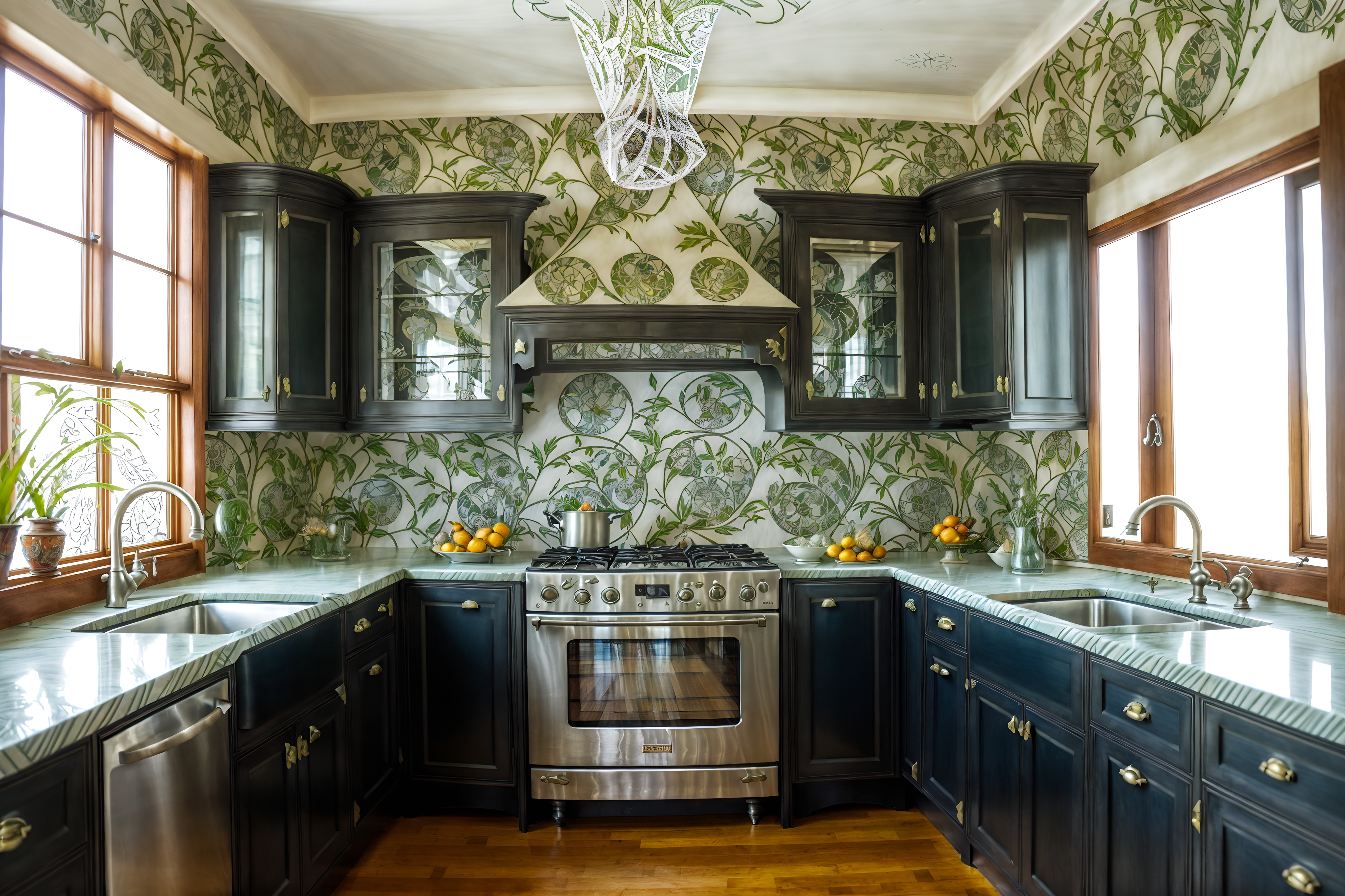 photo from pinterest of art nouveau-style interior designed (kitchen interior) with kitchen cabinets and refrigerator and worktops and plant and sink and stove and kitchen cabinets. . with asymmetrical shapes and wallpaper patterns of feathers and stained glass and curving, plant-like embellishments and japanese motifs and curved glass and wallpaper pattners of spider webs and arches and curved forms. . cinematic photo, highly detailed, cinematic lighting, ultra-detailed, ultrarealistic, photorealism, 8k. trending on pinterest. art nouveau interior design style. masterpiece, cinematic light, ultrarealistic+, photorealistic+, 8k, raw photo, realistic, sharp focus on eyes, (symmetrical eyes), (intact eyes), hyperrealistic, highest quality, best quality, , highly detailed, masterpiece, best quality, extremely detailed 8k wallpaper, masterpiece, best quality, ultra-detailed, best shadow, detailed background, detailed face, detailed eyes, high contrast, best illumination, detailed face, dulux, caustic, dynamic angle, detailed glow. dramatic lighting. highly detailed, insanely detailed hair, symmetrical, intricate details, professionally retouched, 8k high definition. strong bokeh. award winning photo.