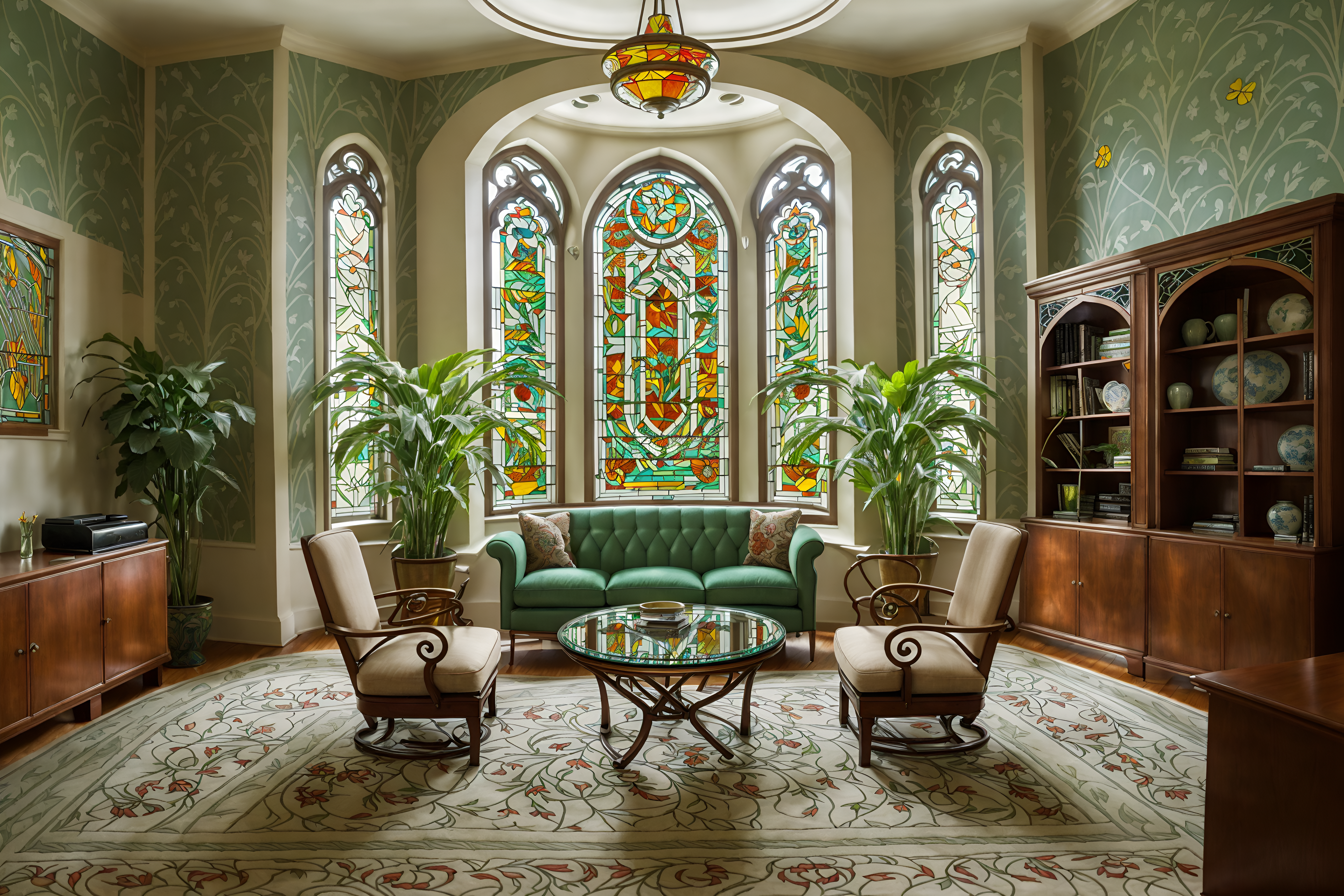photo from pinterest of art nouveau-style interior designed (office interior) with windows and lounge chairs and cabinets and computer desks and plants and seating area with sofa and office desks and office chairs. . with stained glass and curved glass and wallpaper patterns of stylized flowers and wallpaper patterns of feathers and stained glass and arches and curved forms and mosaics and soft, rounded lines. . cinematic photo, highly detailed, cinematic lighting, ultra-detailed, ultrarealistic, photorealism, 8k. trending on pinterest. art nouveau interior design style. masterpiece, cinematic light, ultrarealistic+, photorealistic+, 8k, raw photo, realistic, sharp focus on eyes, (symmetrical eyes), (intact eyes), hyperrealistic, highest quality, best quality, , highly detailed, masterpiece, best quality, extremely detailed 8k wallpaper, masterpiece, best quality, ultra-detailed, best shadow, detailed background, detailed face, detailed eyes, high contrast, best illumination, detailed face, dulux, caustic, dynamic angle, detailed glow. dramatic lighting. highly detailed, insanely detailed hair, symmetrical, intricate details, professionally retouched, 8k high definition. strong bokeh. award winning photo.