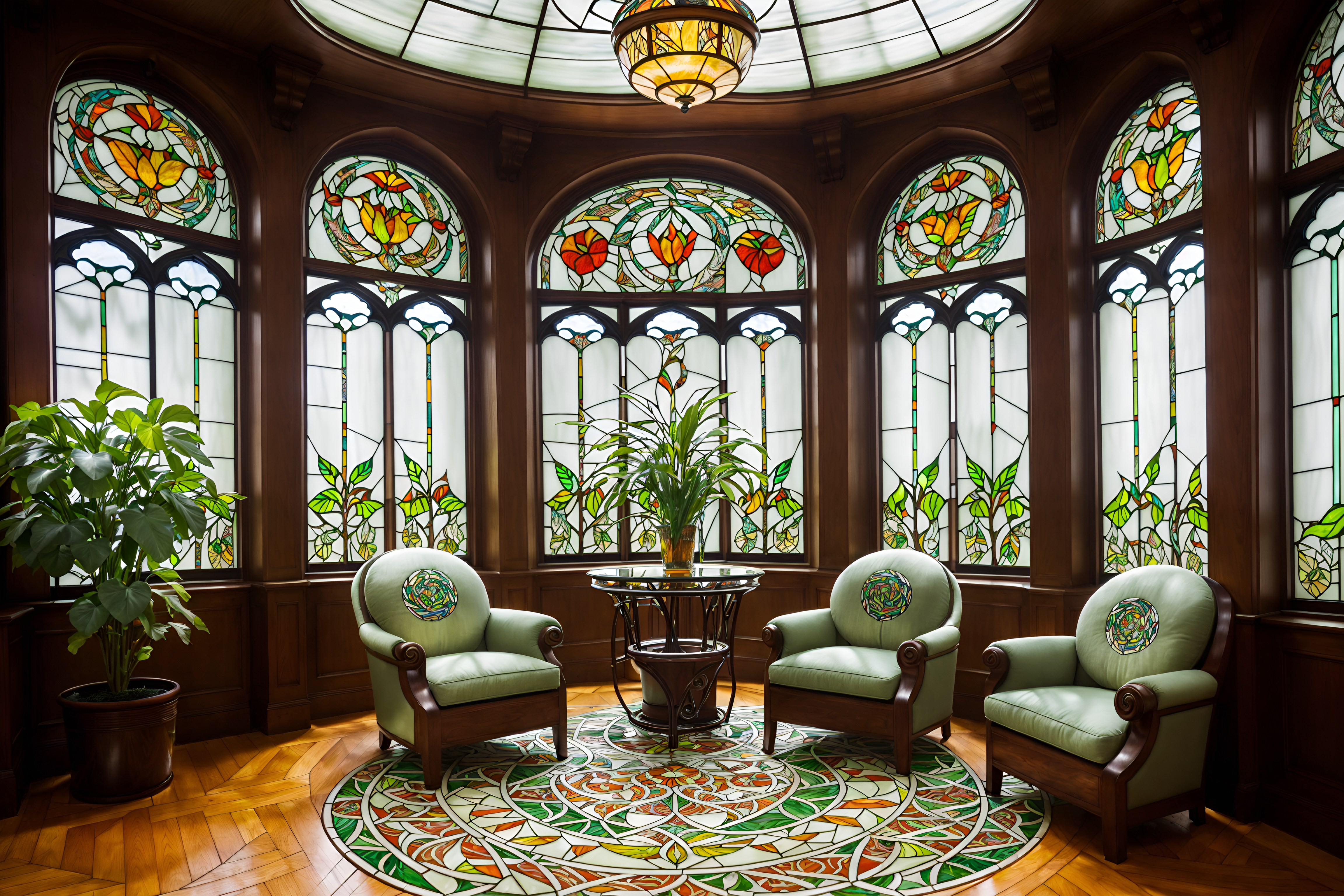 photo from pinterest of art nouveau-style interior designed (office interior) with windows and lounge chairs and cabinets and computer desks and plants and seating area with sofa and office desks and office chairs. . with stained glass and curved glass and wallpaper patterns of stylized flowers and wallpaper patterns of feathers and stained glass and arches and curved forms and mosaics and soft, rounded lines. . cinematic photo, highly detailed, cinematic lighting, ultra-detailed, ultrarealistic, photorealism, 8k. trending on pinterest. art nouveau interior design style. masterpiece, cinematic light, ultrarealistic+, photorealistic+, 8k, raw photo, realistic, sharp focus on eyes, (symmetrical eyes), (intact eyes), hyperrealistic, highest quality, best quality, , highly detailed, masterpiece, best quality, extremely detailed 8k wallpaper, masterpiece, best quality, ultra-detailed, best shadow, detailed background, detailed face, detailed eyes, high contrast, best illumination, detailed face, dulux, caustic, dynamic angle, detailed glow. dramatic lighting. highly detailed, insanely detailed hair, symmetrical, intricate details, professionally retouched, 8k high definition. strong bokeh. award winning photo.