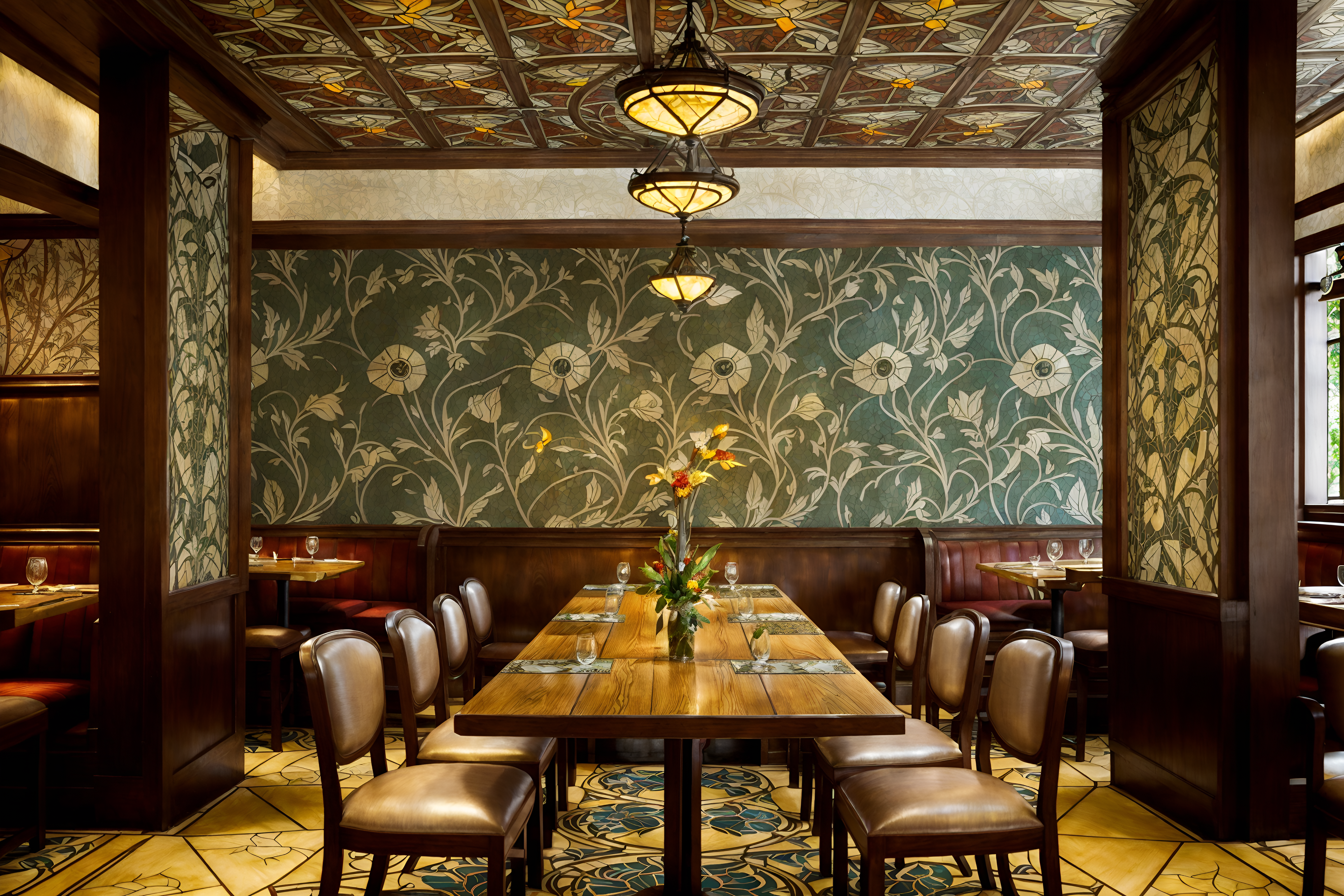 photo from pinterest of art nouveau-style interior designed (restaurant interior) with restaurant chairs and restaurant decor and restaurant dining tables and restaurant bar and restaurant chairs. . with asymmetrical shapes and natural materials and stained glass and wallpaper patterns of stylized flowers and mosaics and ashy colors and wallpaper pattners of spider webs and wallpaper patterns of feathers. . cinematic photo, highly detailed, cinematic lighting, ultra-detailed, ultrarealistic, photorealism, 8k. trending on pinterest. art nouveau interior design style. masterpiece, cinematic light, ultrarealistic+, photorealistic+, 8k, raw photo, realistic, sharp focus on eyes, (symmetrical eyes), (intact eyes), hyperrealistic, highest quality, best quality, , highly detailed, masterpiece, best quality, extremely detailed 8k wallpaper, masterpiece, best quality, ultra-detailed, best shadow, detailed background, detailed face, detailed eyes, high contrast, best illumination, detailed face, dulux, caustic, dynamic angle, detailed glow. dramatic lighting. highly detailed, insanely detailed hair, symmetrical, intricate details, professionally retouched, 8k high definition. strong bokeh. award winning photo.