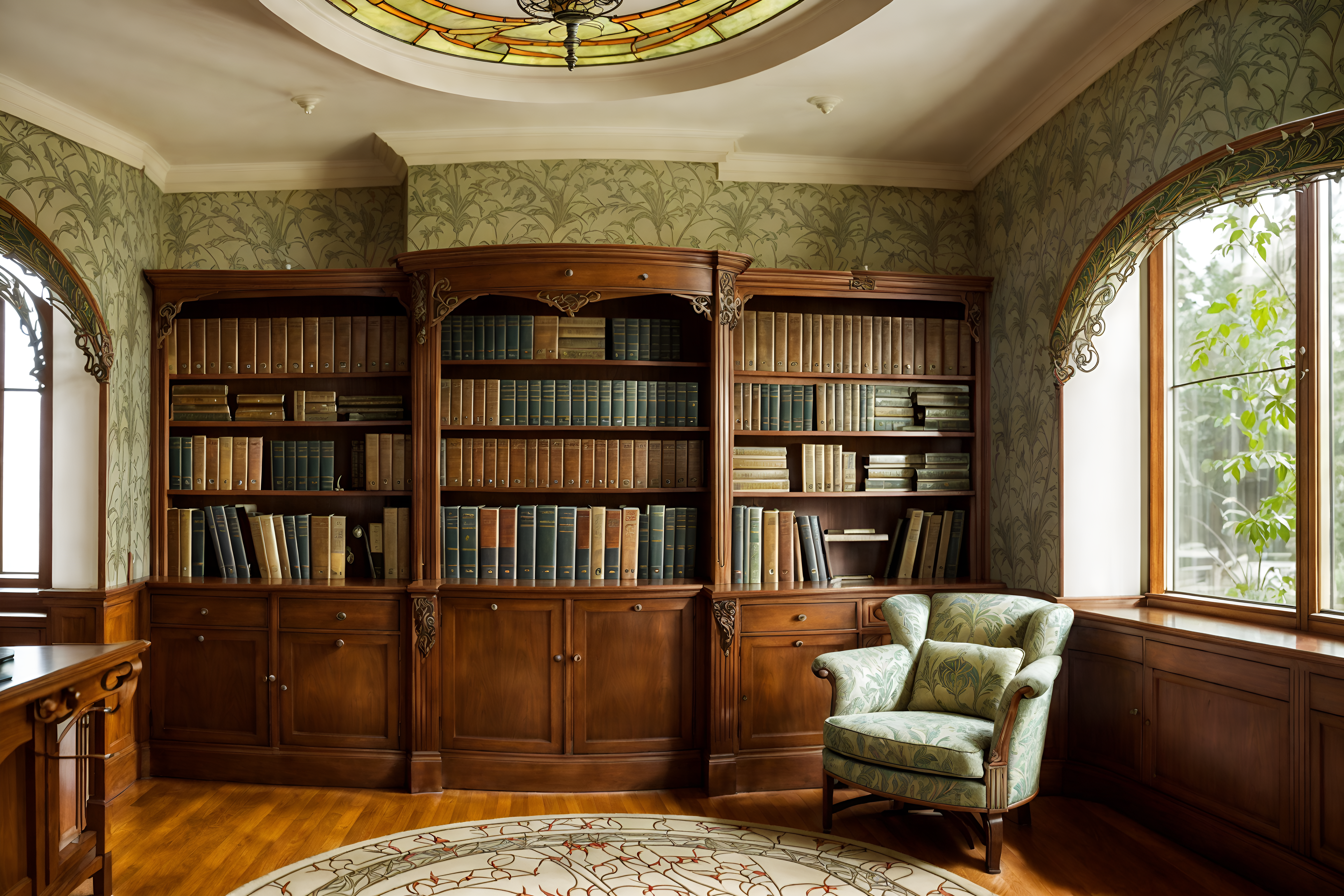 photo from pinterest of art nouveau-style interior designed (study room interior) with bookshelves and office chair and plant and desk lamp and lounge chair and cabinets and writing desk and bookshelves. . with arches and curved forms and curving, plant-like embellishments and soft, rounded lines and stained glass and wallpaper pattners of spider webs and wallpaper patterns of feathers and curved glass and stained glass. . cinematic photo, highly detailed, cinematic lighting, ultra-detailed, ultrarealistic, photorealism, 8k. trending on pinterest. art nouveau interior design style. masterpiece, cinematic light, ultrarealistic+, photorealistic+, 8k, raw photo, realistic, sharp focus on eyes, (symmetrical eyes), (intact eyes), hyperrealistic, highest quality, best quality, , highly detailed, masterpiece, best quality, extremely detailed 8k wallpaper, masterpiece, best quality, ultra-detailed, best shadow, detailed background, detailed face, detailed eyes, high contrast, best illumination, detailed face, dulux, caustic, dynamic angle, detailed glow. dramatic lighting. highly detailed, insanely detailed hair, symmetrical, intricate details, professionally retouched, 8k high definition. strong bokeh. award winning photo.
