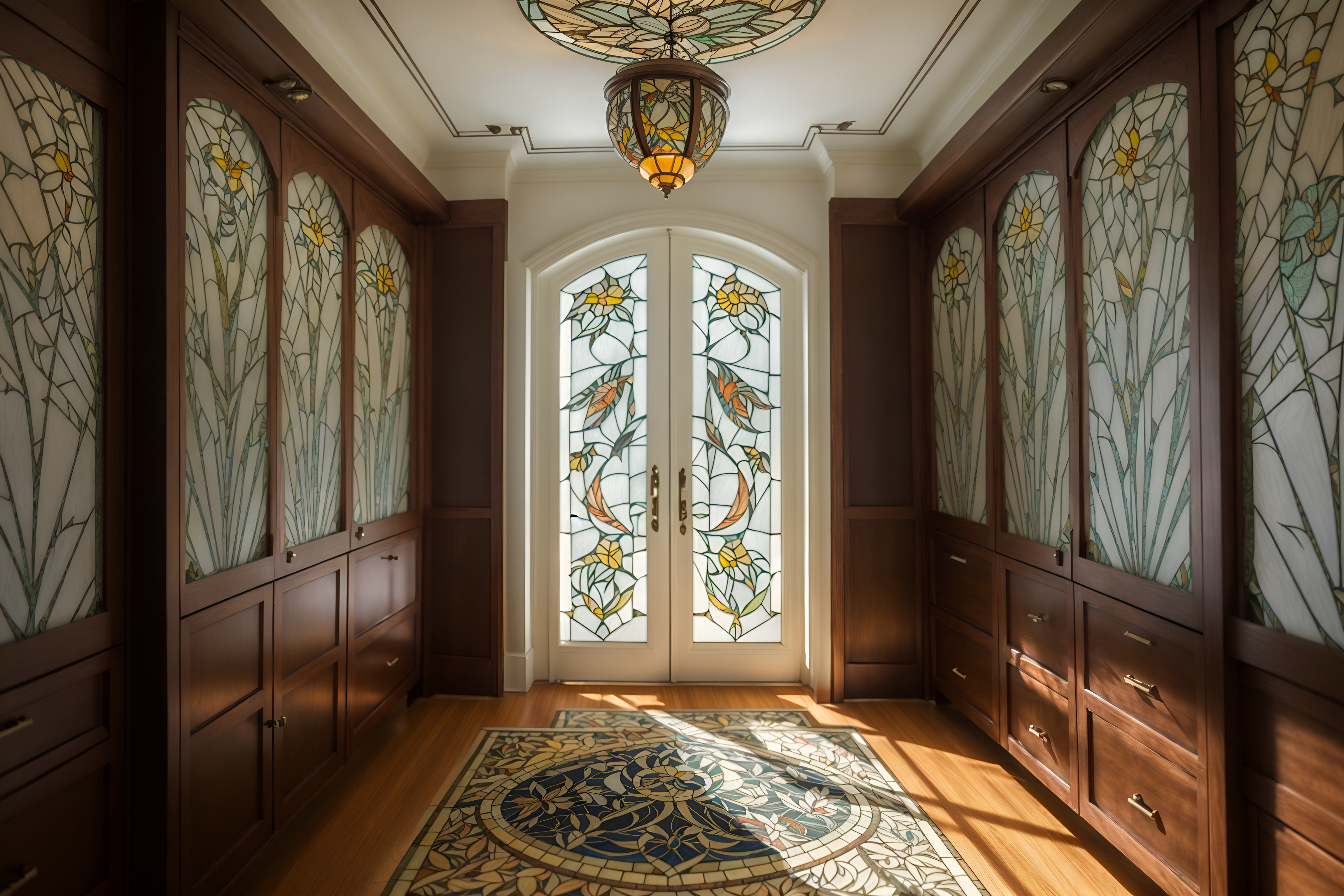 photo from pinterest of art nouveau-style interior designed (walk in closet interior) . with wallpaper patterns of feathers and stained glass and mosaics and curved glass and japanese motifs and soft, rounded lines and natural materials and wallpaper patterns of stylized flowers. . cinematic photo, highly detailed, cinematic lighting, ultra-detailed, ultrarealistic, photorealism, 8k. trending on pinterest. art nouveau interior design style. masterpiece, cinematic light, ultrarealistic+, photorealistic+, 8k, raw photo, realistic, sharp focus on eyes, (symmetrical eyes), (intact eyes), hyperrealistic, highest quality, best quality, , highly detailed, masterpiece, best quality, extremely detailed 8k wallpaper, masterpiece, best quality, ultra-detailed, best shadow, detailed background, detailed face, detailed eyes, high contrast, best illumination, detailed face, dulux, caustic, dynamic angle, detailed glow. dramatic lighting. highly detailed, insanely detailed hair, symmetrical, intricate details, professionally retouched, 8k high definition. strong bokeh. award winning photo.