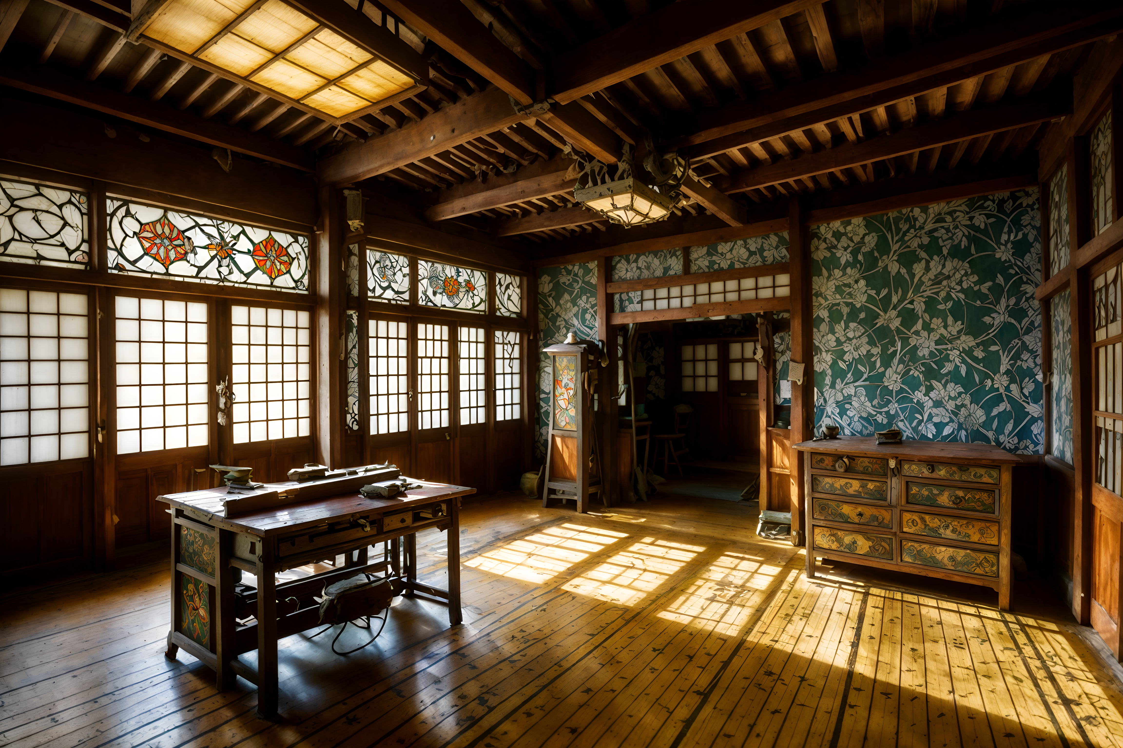 photo from pinterest of art nouveau-style interior designed (workshop interior) with messy and wooden workbench and tool wall and messy. . with asymmetrical shapes and japanese motifs and arches and curved forms and wallpaper patterns of stylized flowers and wallpaper patterns of feathers and stained glass and mosaics and soft, rounded lines. . cinematic photo, highly detailed, cinematic lighting, ultra-detailed, ultrarealistic, photorealism, 8k. trending on pinterest. art nouveau interior design style. masterpiece, cinematic light, ultrarealistic+, photorealistic+, 8k, raw photo, realistic, sharp focus on eyes, (symmetrical eyes), (intact eyes), hyperrealistic, highest quality, best quality, , highly detailed, masterpiece, best quality, extremely detailed 8k wallpaper, masterpiece, best quality, ultra-detailed, best shadow, detailed background, detailed face, detailed eyes, high contrast, best illumination, detailed face, dulux, caustic, dynamic angle, detailed glow. dramatic lighting. highly detailed, insanely detailed hair, symmetrical, intricate details, professionally retouched, 8k high definition. strong bokeh. award winning photo.