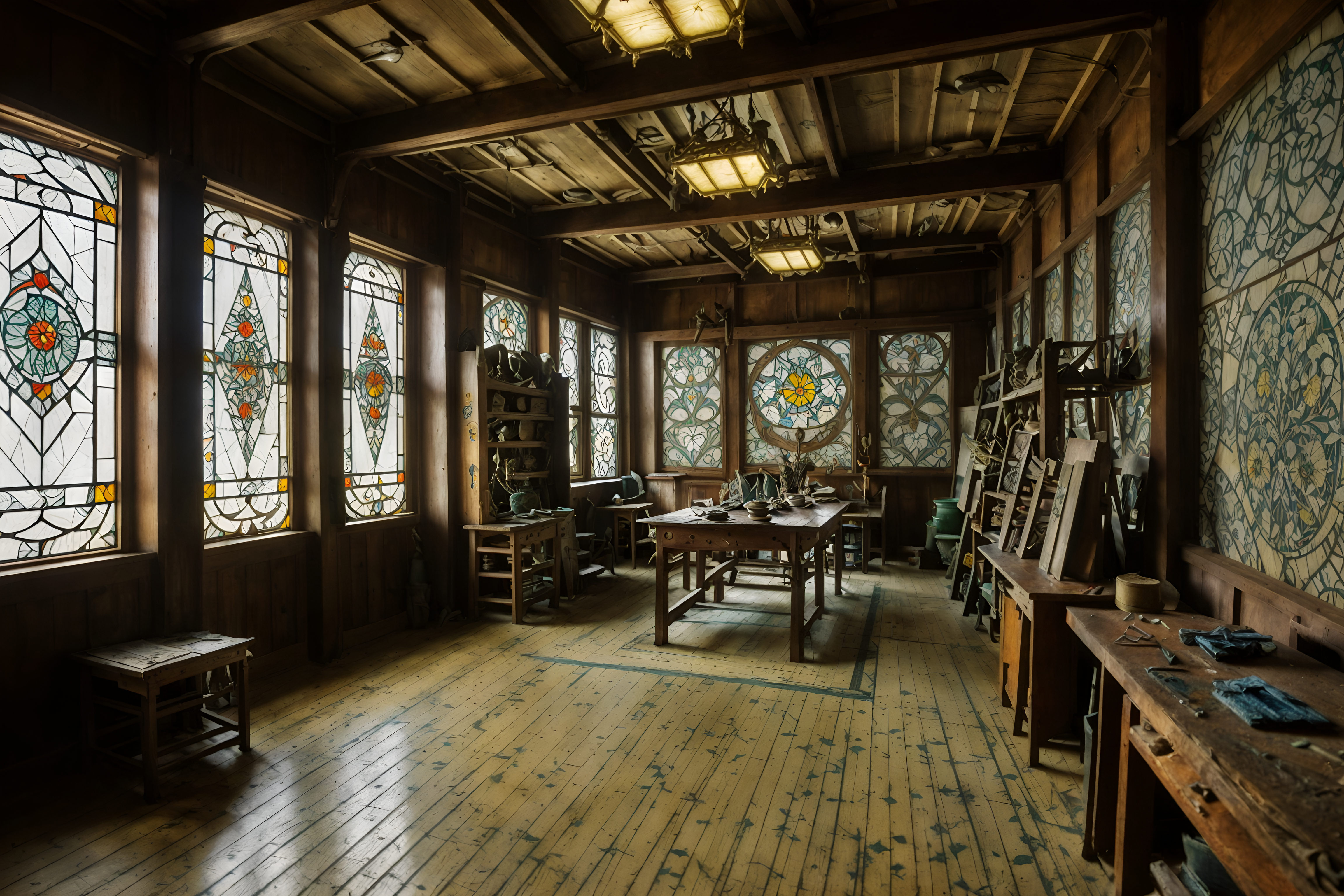 photo from pinterest of art nouveau-style interior designed (workshop interior) with messy and wooden workbench and tool wall and messy. . with asymmetrical shapes and japanese motifs and arches and curved forms and wallpaper patterns of stylized flowers and wallpaper patterns of feathers and stained glass and mosaics and soft, rounded lines. . cinematic photo, highly detailed, cinematic lighting, ultra-detailed, ultrarealistic, photorealism, 8k. trending on pinterest. art nouveau interior design style. masterpiece, cinematic light, ultrarealistic+, photorealistic+, 8k, raw photo, realistic, sharp focus on eyes, (symmetrical eyes), (intact eyes), hyperrealistic, highest quality, best quality, , highly detailed, masterpiece, best quality, extremely detailed 8k wallpaper, masterpiece, best quality, ultra-detailed, best shadow, detailed background, detailed face, detailed eyes, high contrast, best illumination, detailed face, dulux, caustic, dynamic angle, detailed glow. dramatic lighting. highly detailed, insanely detailed hair, symmetrical, intricate details, professionally retouched, 8k high definition. strong bokeh. award winning photo.
