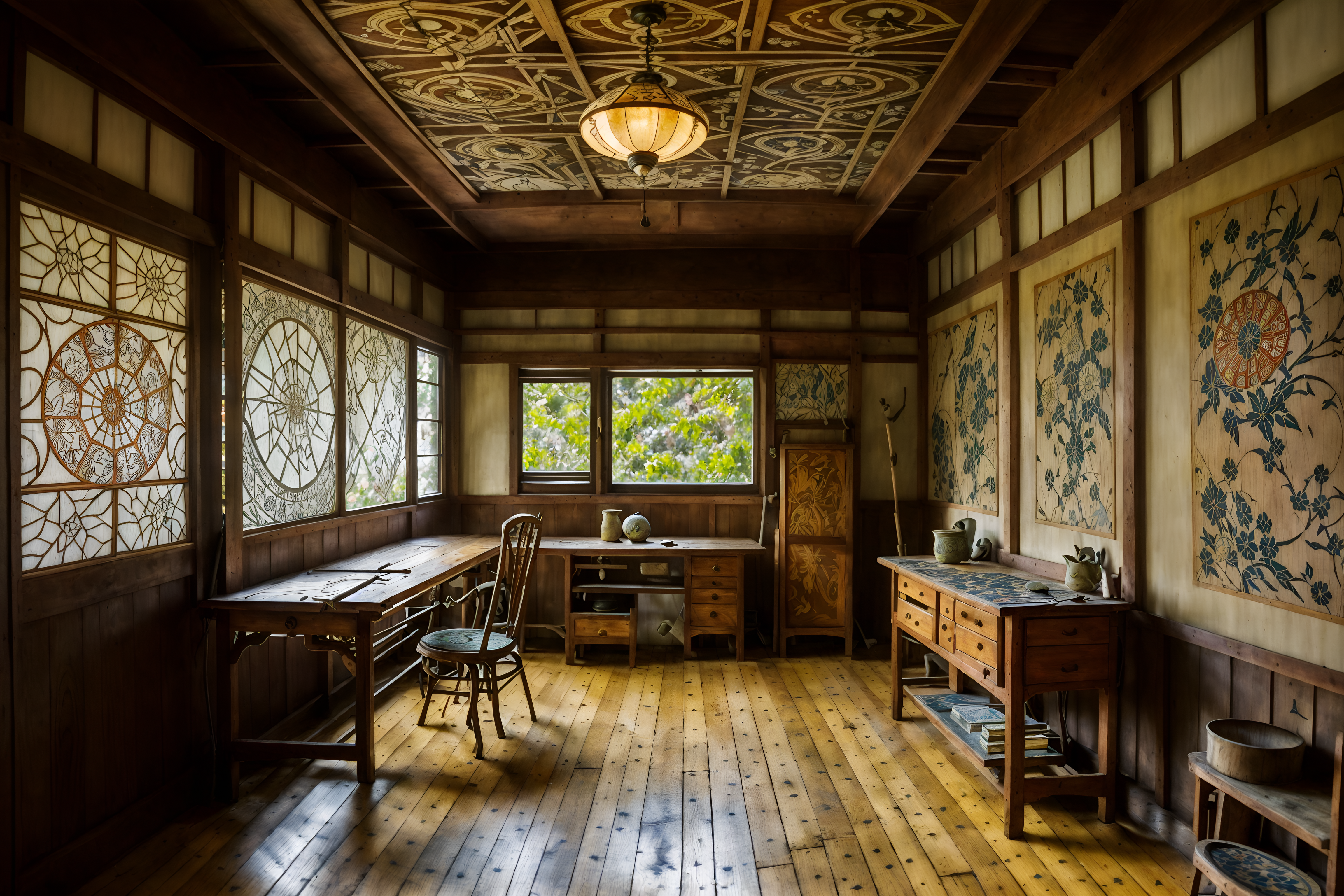 photo from pinterest of art nouveau-style interior designed (workshop interior) with wooden workbench and messy and tool wall and wooden workbench. . with japanese motifs and wallpaper patterns of stylized flowers and curved glass and ashy colors and natural materials and mosaics and wallpaper pattners of spider webs and arches and curved forms. . cinematic photo, highly detailed, cinematic lighting, ultra-detailed, ultrarealistic, photorealism, 8k. trending on pinterest. art nouveau interior design style. masterpiece, cinematic light, ultrarealistic+, photorealistic+, 8k, raw photo, realistic, sharp focus on eyes, (symmetrical eyes), (intact eyes), hyperrealistic, highest quality, best quality, , highly detailed, masterpiece, best quality, extremely detailed 8k wallpaper, masterpiece, best quality, ultra-detailed, best shadow, detailed background, detailed face, detailed eyes, high contrast, best illumination, detailed face, dulux, caustic, dynamic angle, detailed glow. dramatic lighting. highly detailed, insanely detailed hair, symmetrical, intricate details, professionally retouched, 8k high definition. strong bokeh. award winning photo.
