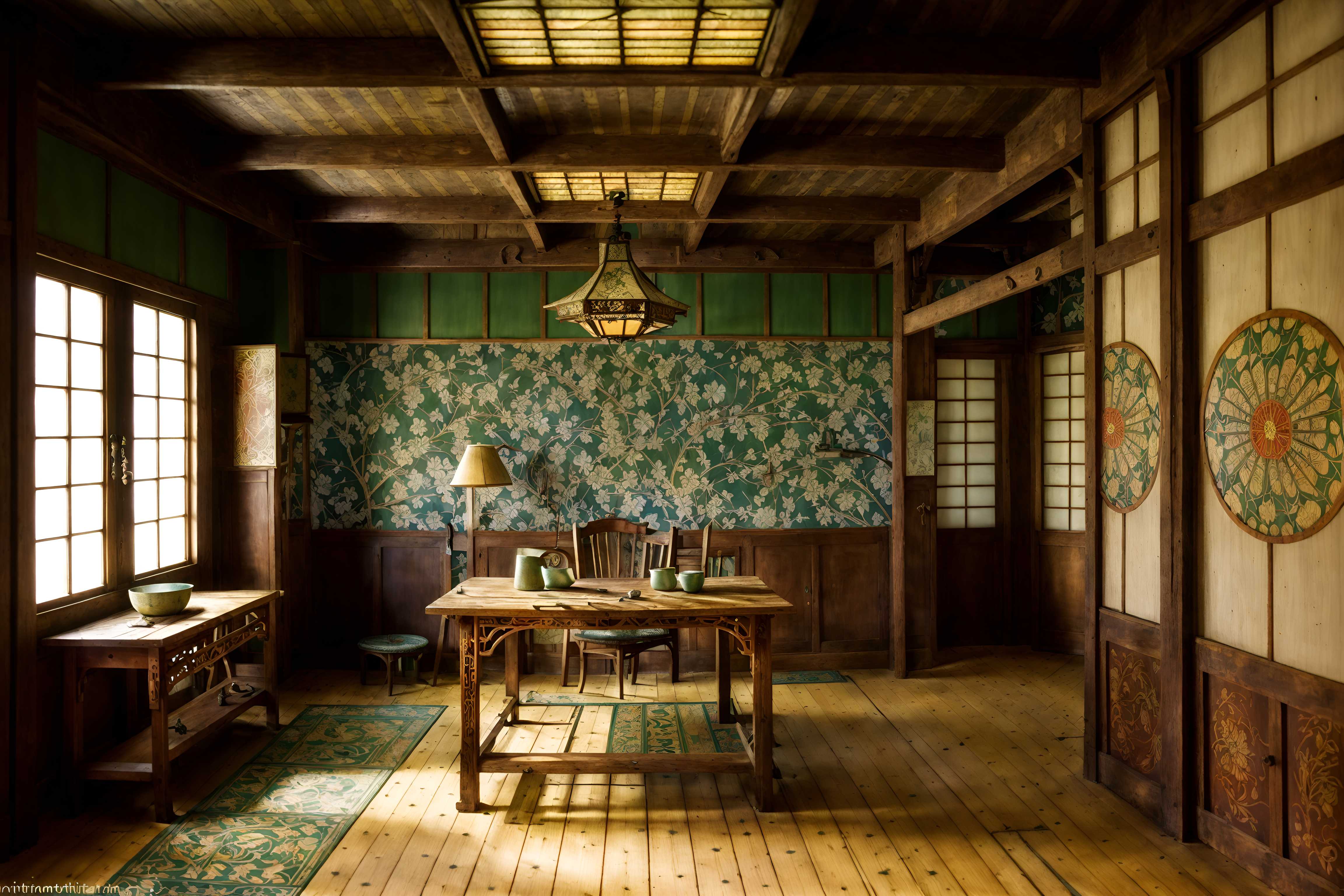 photo from pinterest of art nouveau-style interior designed (workshop interior) with wooden workbench and messy and tool wall and wooden workbench. . with japanese motifs and wallpaper patterns of stylized flowers and curved glass and ashy colors and natural materials and mosaics and wallpaper pattners of spider webs and arches and curved forms. . cinematic photo, highly detailed, cinematic lighting, ultra-detailed, ultrarealistic, photorealism, 8k. trending on pinterest. art nouveau interior design style. masterpiece, cinematic light, ultrarealistic+, photorealistic+, 8k, raw photo, realistic, sharp focus on eyes, (symmetrical eyes), (intact eyes), hyperrealistic, highest quality, best quality, , highly detailed, masterpiece, best quality, extremely detailed 8k wallpaper, masterpiece, best quality, ultra-detailed, best shadow, detailed background, detailed face, detailed eyes, high contrast, best illumination, detailed face, dulux, caustic, dynamic angle, detailed glow. dramatic lighting. highly detailed, insanely detailed hair, symmetrical, intricate details, professionally retouched, 8k high definition. strong bokeh. award winning photo.
