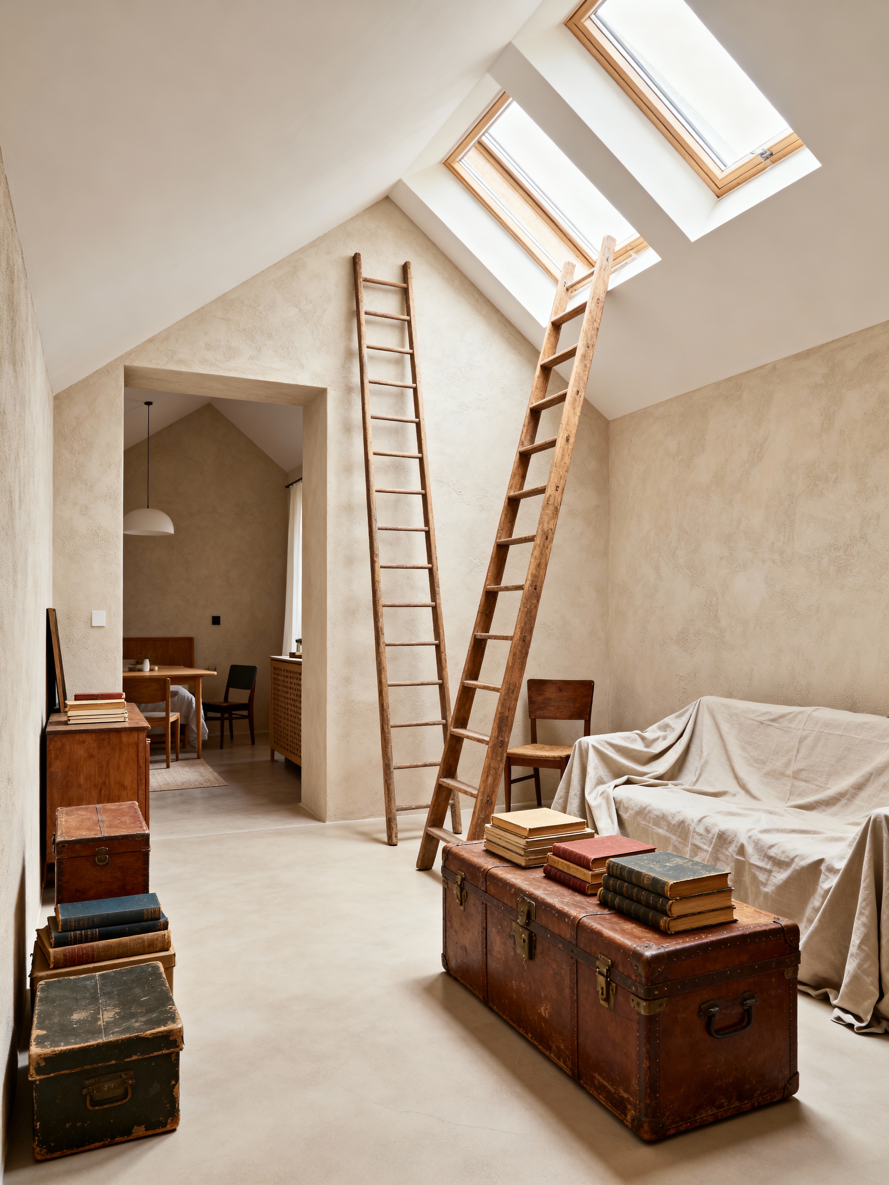 attic with airbnb style with antique items and ladder and old books and vintage trunk and storage boxes and old furniture and skylights and dust sheets. . with simple, clean lines and simplistic furniture and natural materials and elements and neutral walls and textures and open and natural lighting and practicality and functionality and scandinavian style and simple color palette and simple, clean lines and simplistic furniture