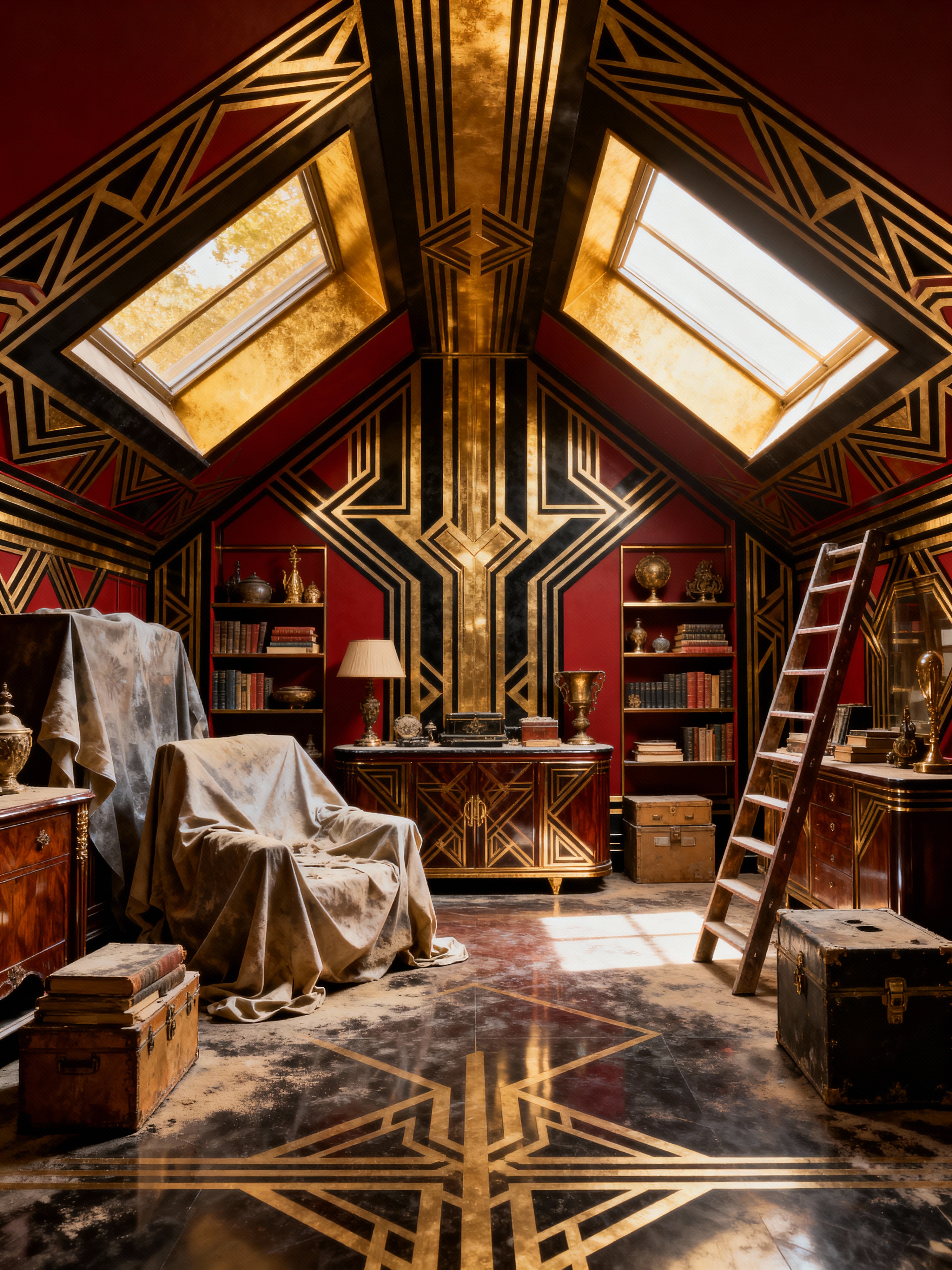 attic with art deco style with old furniture and dust sheets and storage shelves and skylights and antique items and old books and ladder and storage boxes. . with luxury and glamour and abstract patterns and smooth lines and decadent detail and rich colors and exuberant shapes and symmetrical designs