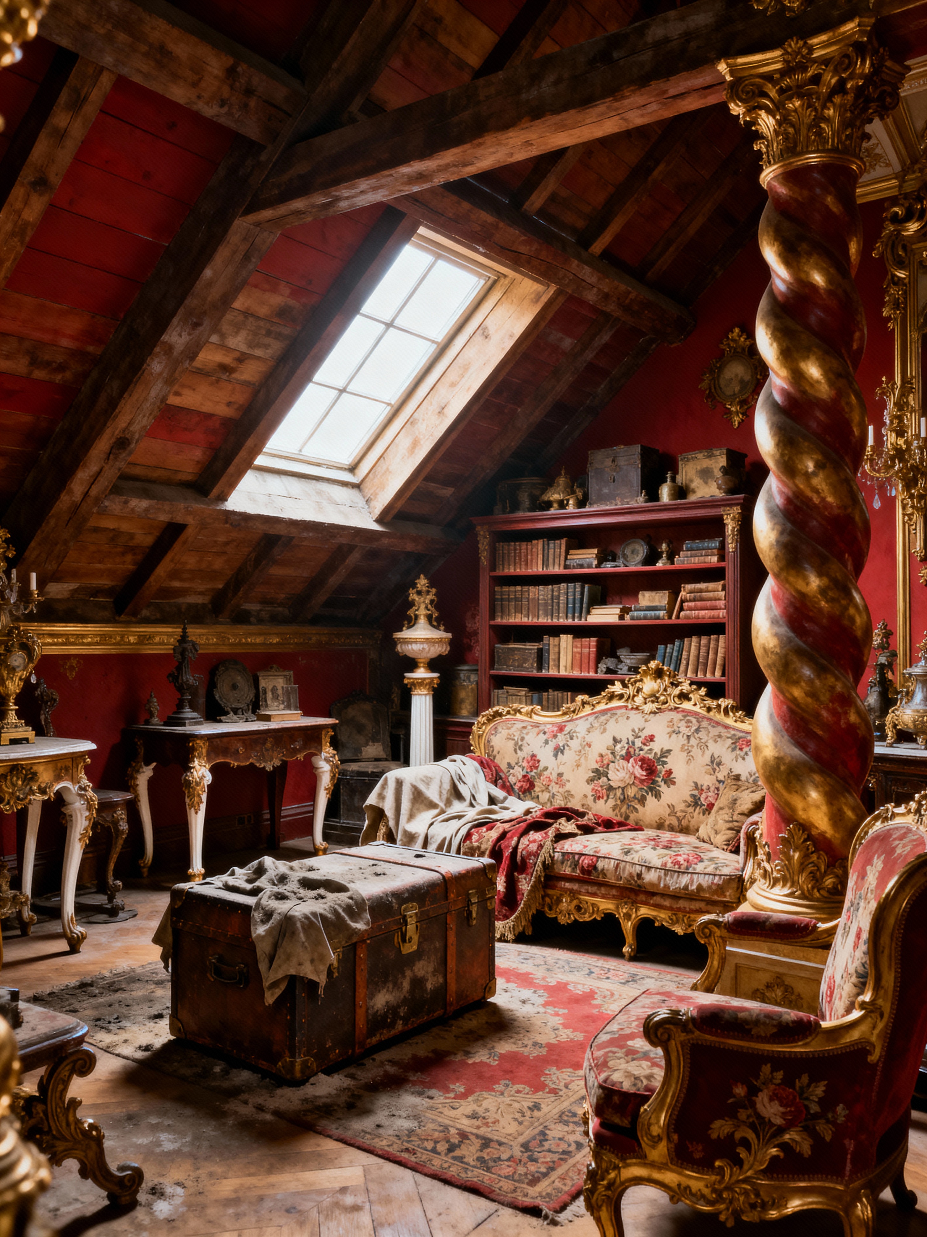 attic with baroque style with old furniture and vintage trunk and skylights and dust sheets and old books and antique items and exposed beams and storage shelves. . with dynamism and pedestal feet and luxurious floral and damask fabrics and intricate carvings and ornaments and twisted columns and opulent and colossal furniture and emotional exuberance and elaborate ornamentation