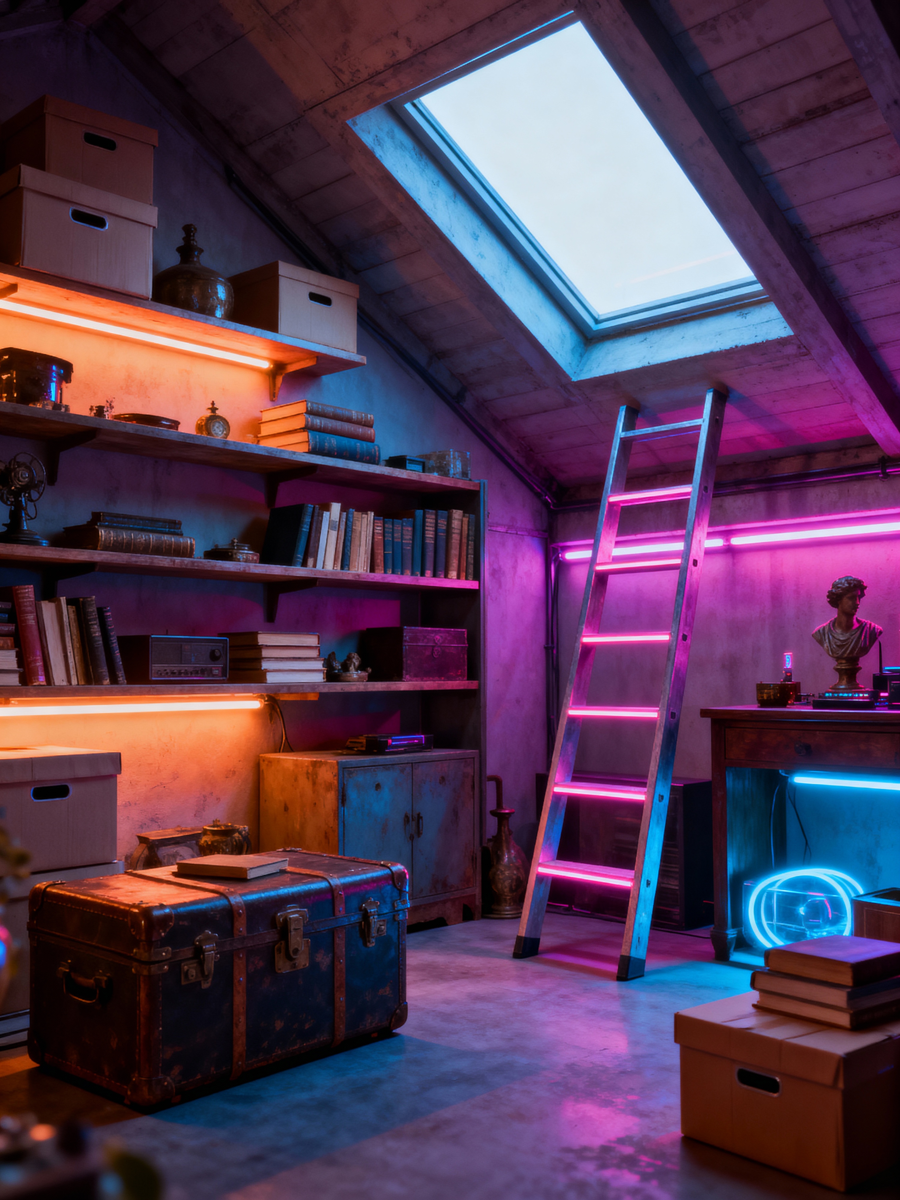 attic with cyberpunk style with storage shelves and old furniture and ladder and old books and skylights and antique items and vintage trunk and storage boxes. . with clean straight square lines and color lights glow and bladerunner lights and minimalist and synthetic objects and synthwave and futuristic cybernetic details and cyberpunk lights