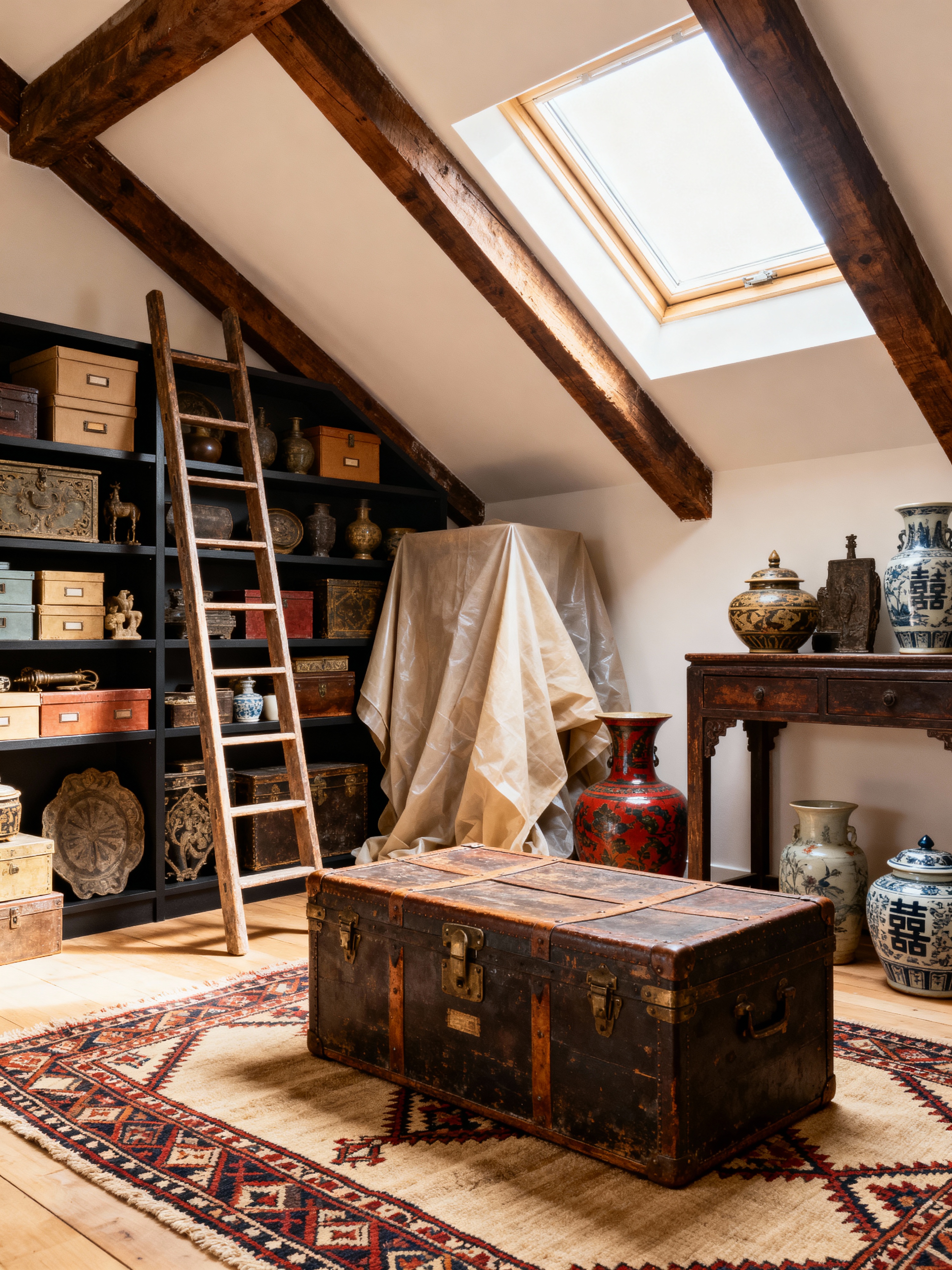 attic with eclectic style with antique items and storage boxes and storage shelves and skylights and vintage trunk and ladder and dust sheets and exposed beams. . with unique pieces and layered textures and mixed styles and vintage finds and unexpected elements and global influences and creative freedom and bold combinations