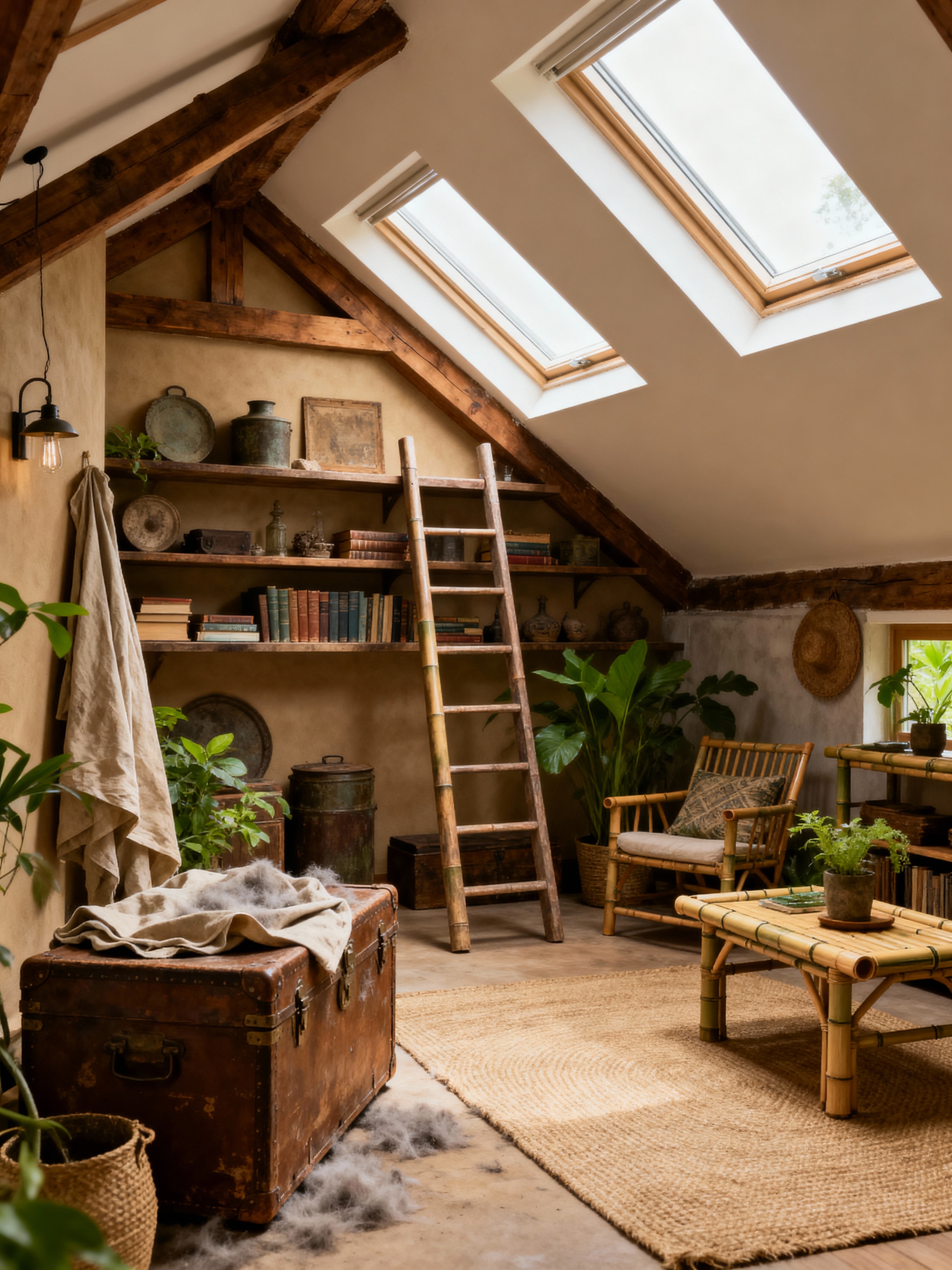 attic with eco-friendly style with vintage trunk and dust sheets and antique items and exposed beams and old books and storage shelves and ladder and skylights. . with green living and reclaimed wood and natural fibers and energy efficient and bamboo furniture and sustainable materials and renewable resources and recycled elements