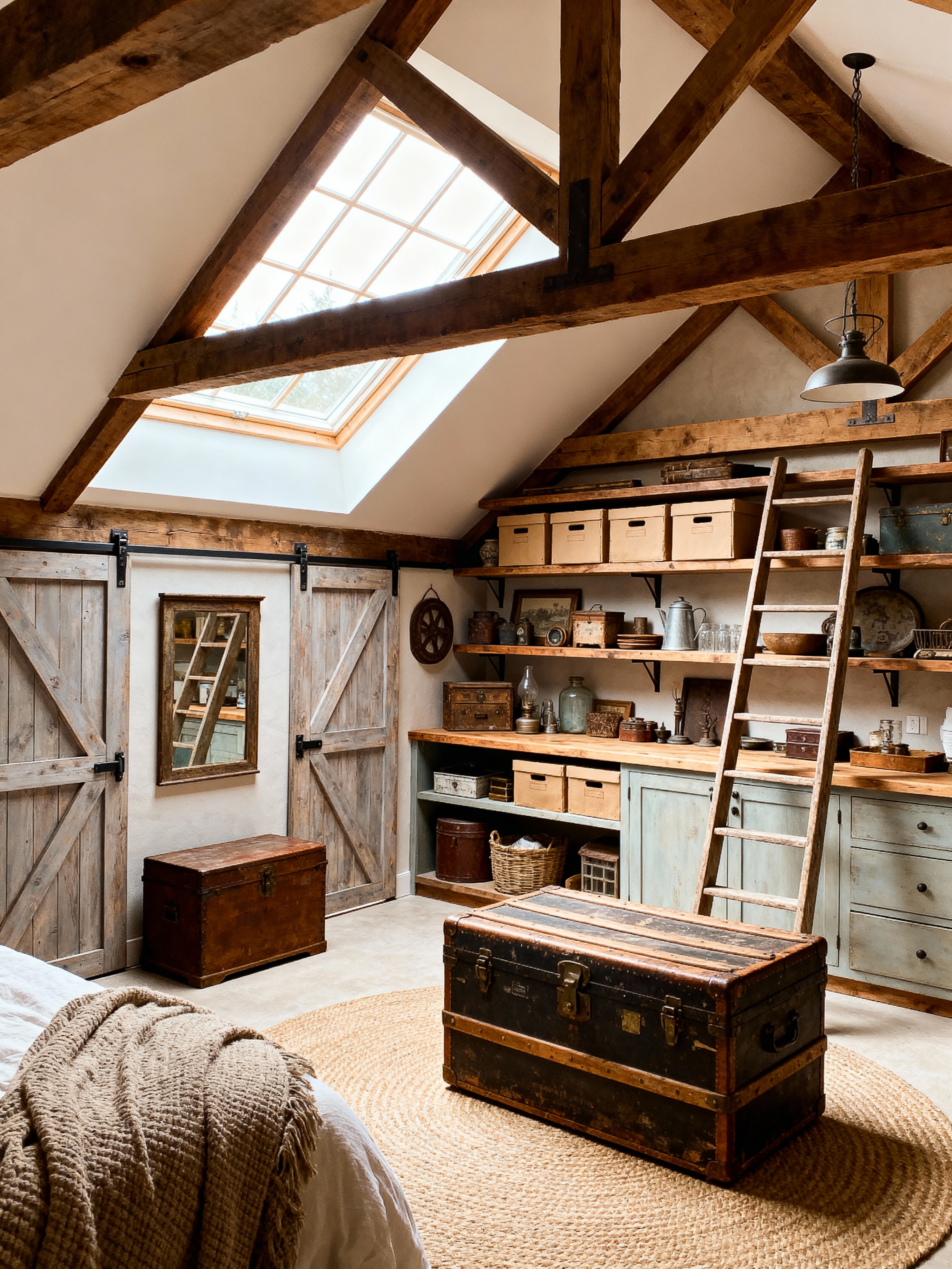 attic with farmhouse style with storage boxes and old furniture and exposed beams and skylights and storage shelves and ladder and vintage trunk and antique items. . with natural textures and vintage decor and country style and industrial accents and cozy feel and open shelving and exposed wood and barn doors