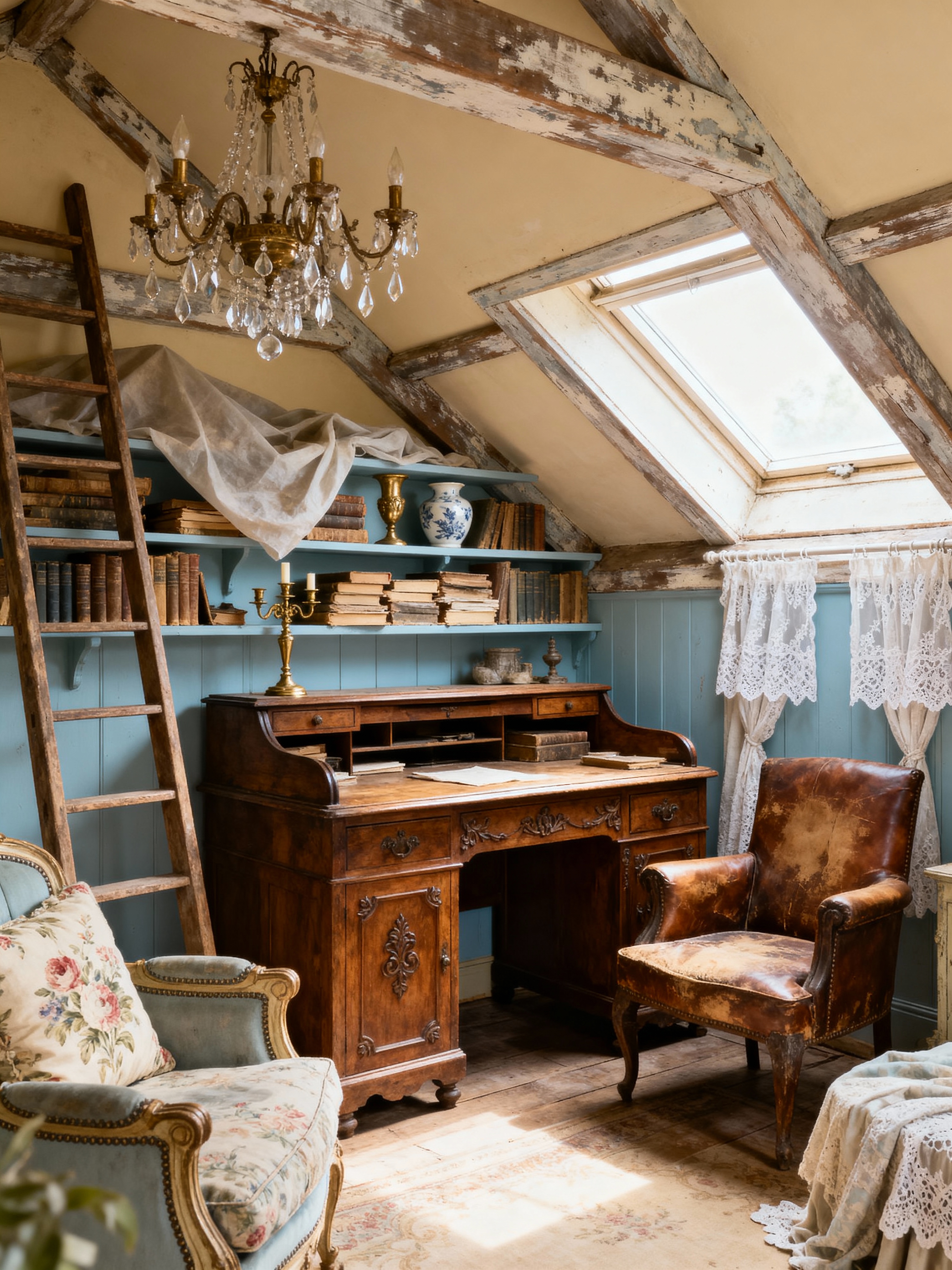 attic with french country style with exposed beams and storage shelves and old books and dust sheets and skylights and antique items and old furniture and ladder. . with vintage furniture and chandeliers and distressed wood and country elegance and antique decor and ornate details and soft fabrics and elegant rustic