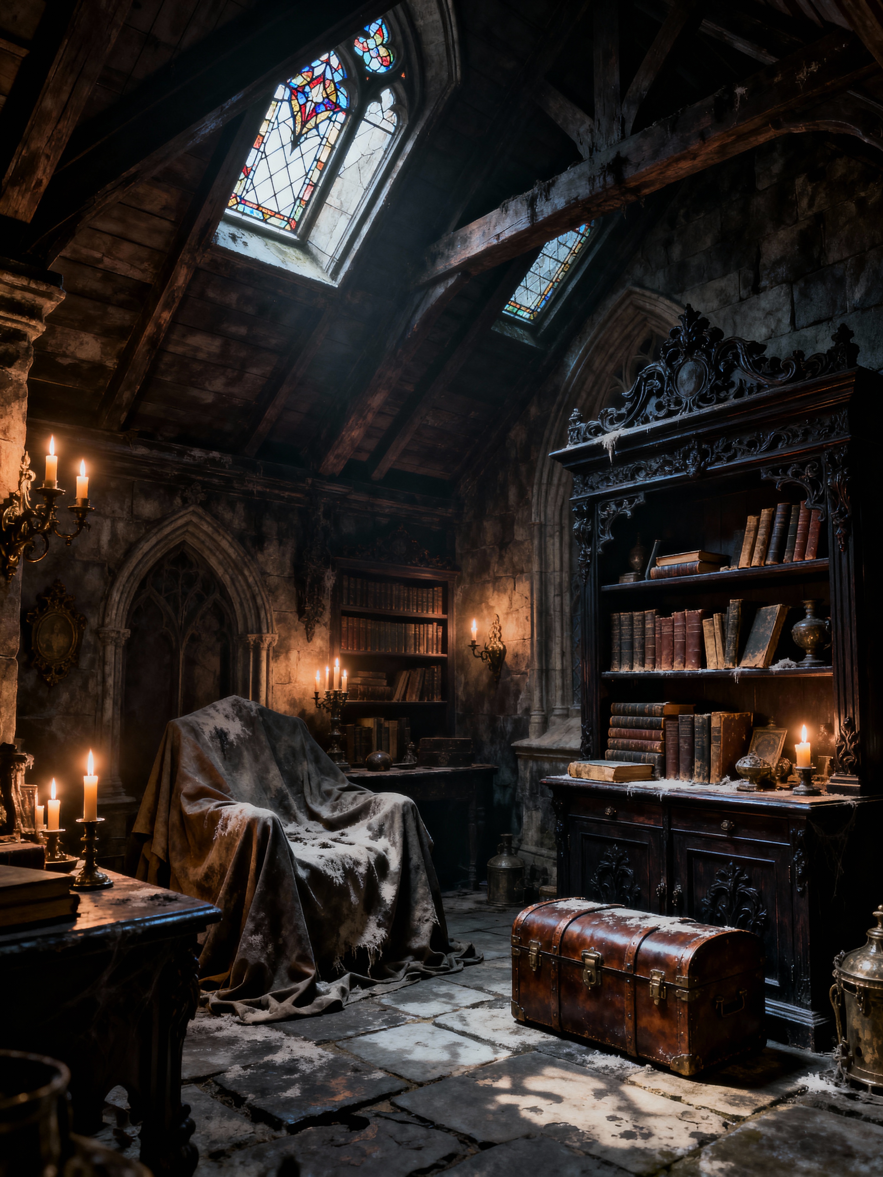 attic with gothic style with old furniture and dust sheets and storage shelves and vintage trunk and skylights and old books and exposed beams and antique items. . with dramatic atmosphere and cathedral style and heavy furniture and candlelit ambiance and mysterious mood and dark colors and ornate details and stone textures