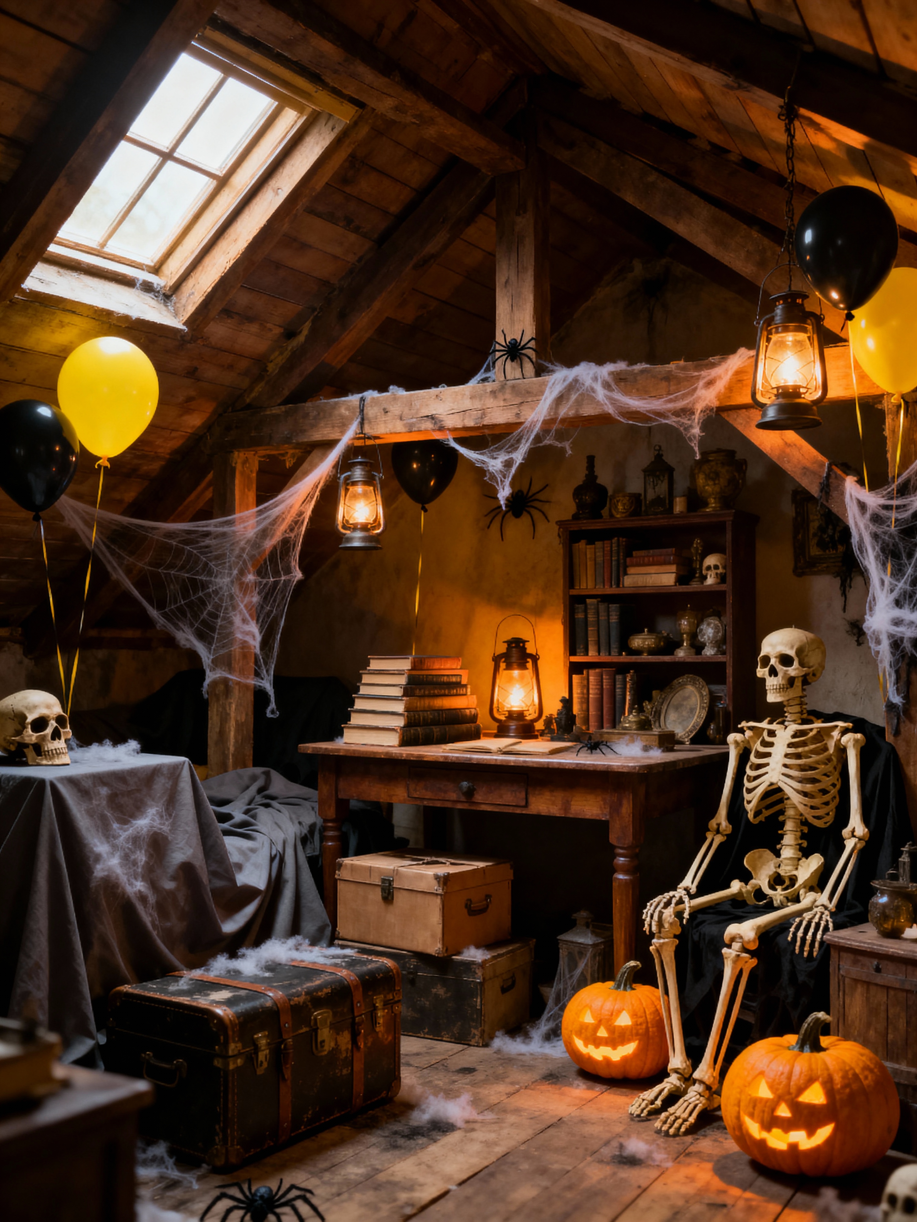 attic with halloween style with dust sheets and storage boxes and exposed beams and vintage trunk and old books and antique items and old furniture and skylights. . with yellow black balloons and lanterns and human skulls and cobwebs and glowing pumpkins and spiderwebs and skeletons sitting and standing and lanterns