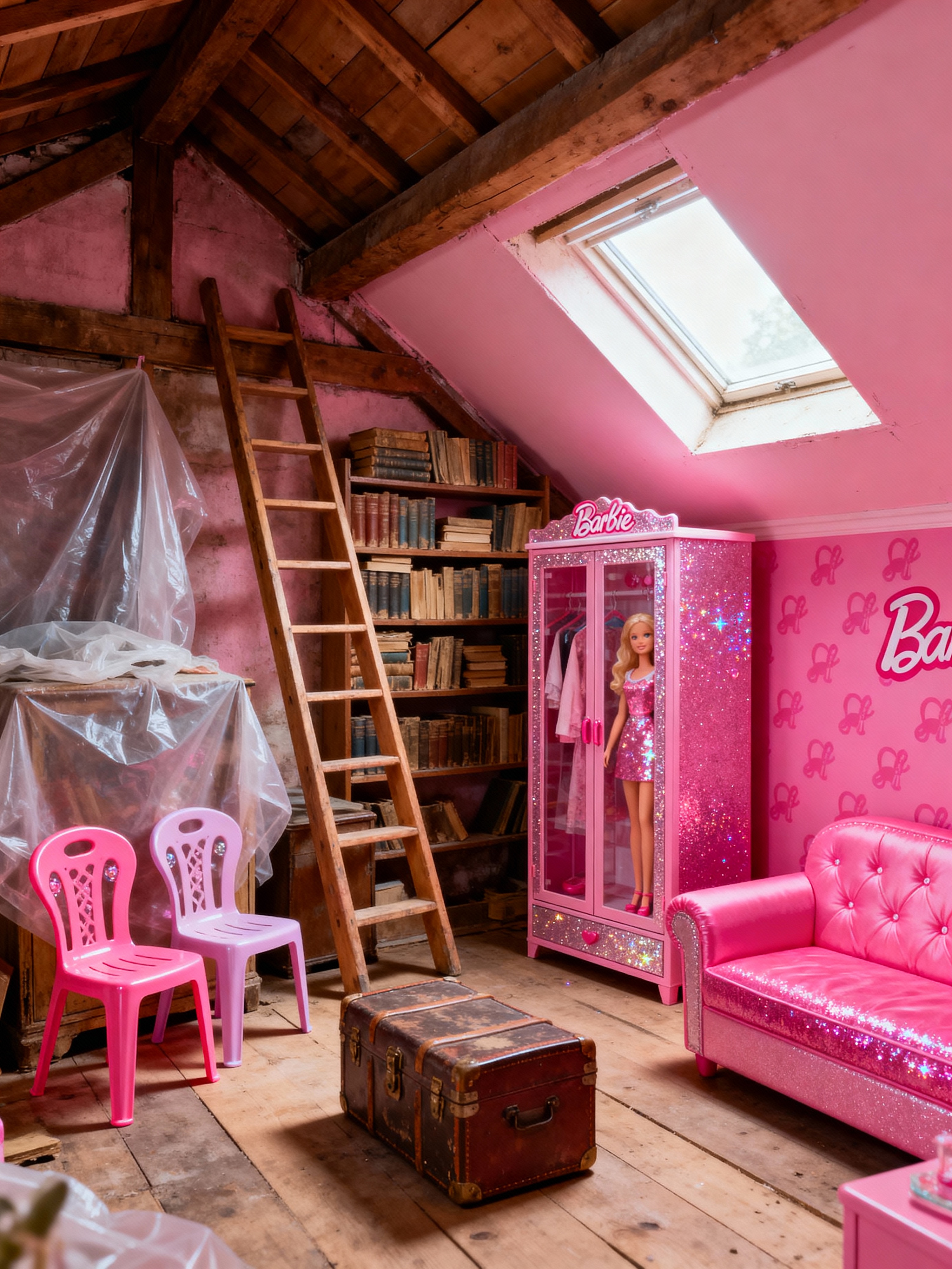 attic with hot pink style with storage shelves and exposed beams and ladder and dust sheets and old books and skylights and vintage trunk and old furniture. . with barbie chairs and barbie plastic interior and barbie closet and hot pink barbie colors and barbie style interior and barbie glitter and sparkle and hot pink barbie walls and barbie sofa