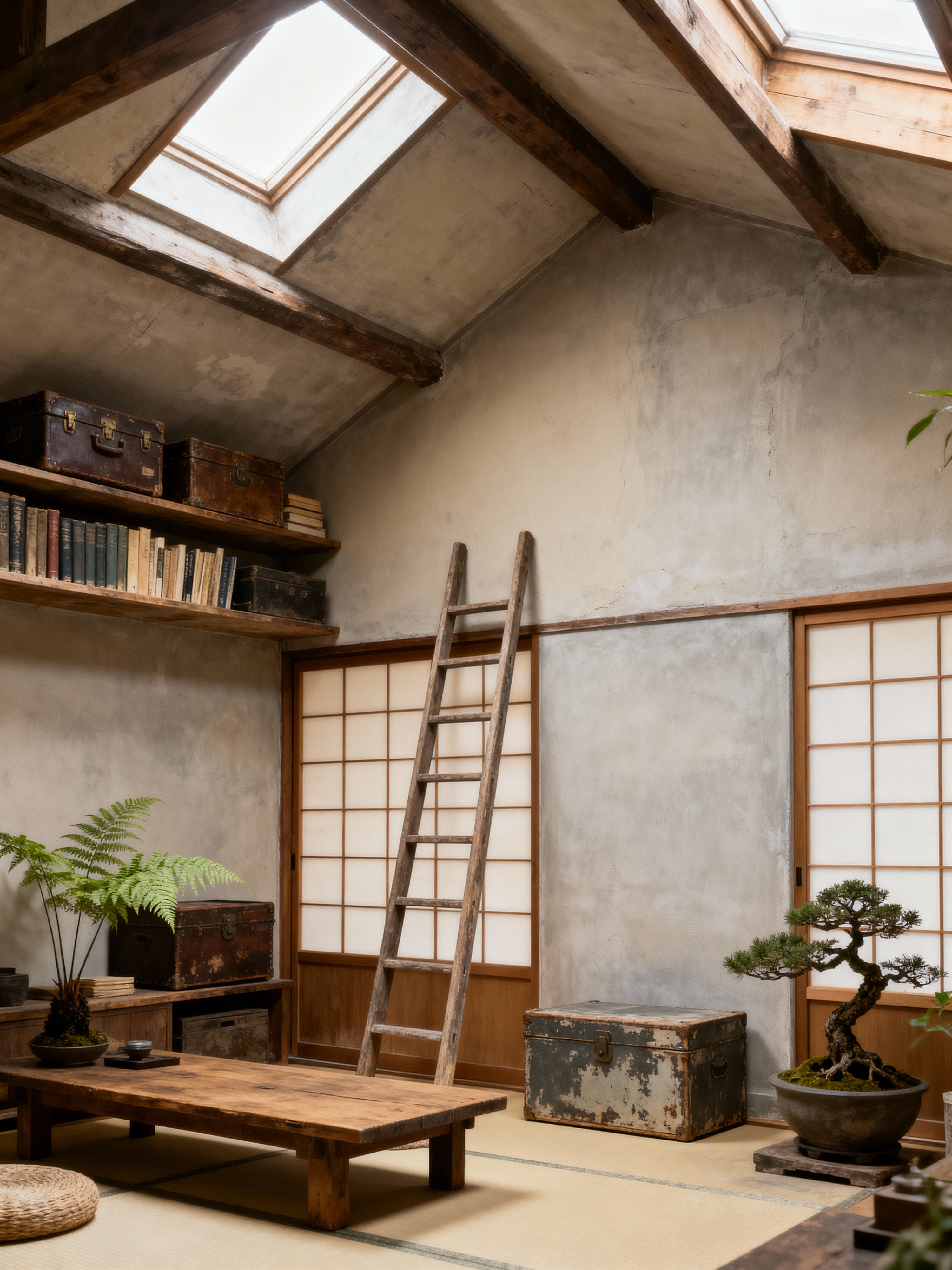attic with japanese design style with storage shelves and old books and old furniture and ladder and vintage trunk and storage boxes and skylights and exposed beams. . with tranquility and indoor plants and wabi-sabi and neutral colors and sliding doors and low furniture and minimalism and zen decor