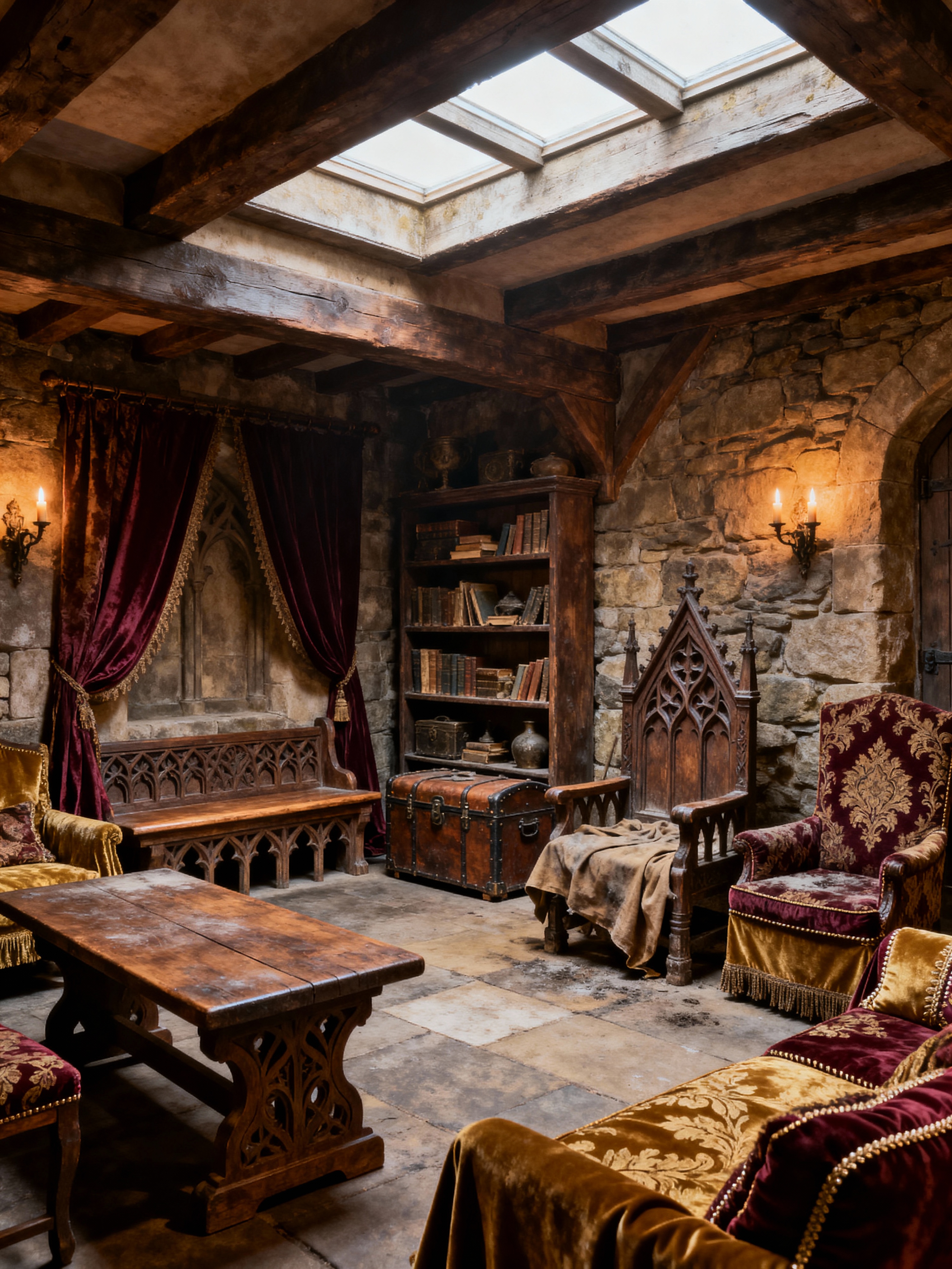 attic with medieval style with exposed beams and old books and old furniture and storage shelves and antique items and dust sheets and vintage trunk and skylights. . with carved wooden benches and carved wooden tables and gothic appearance and velvet, chenille, damask, and brocade draperies and fabrics and carved wooden chairs and stone walls and timber beams and upholstery on chairs and sofas