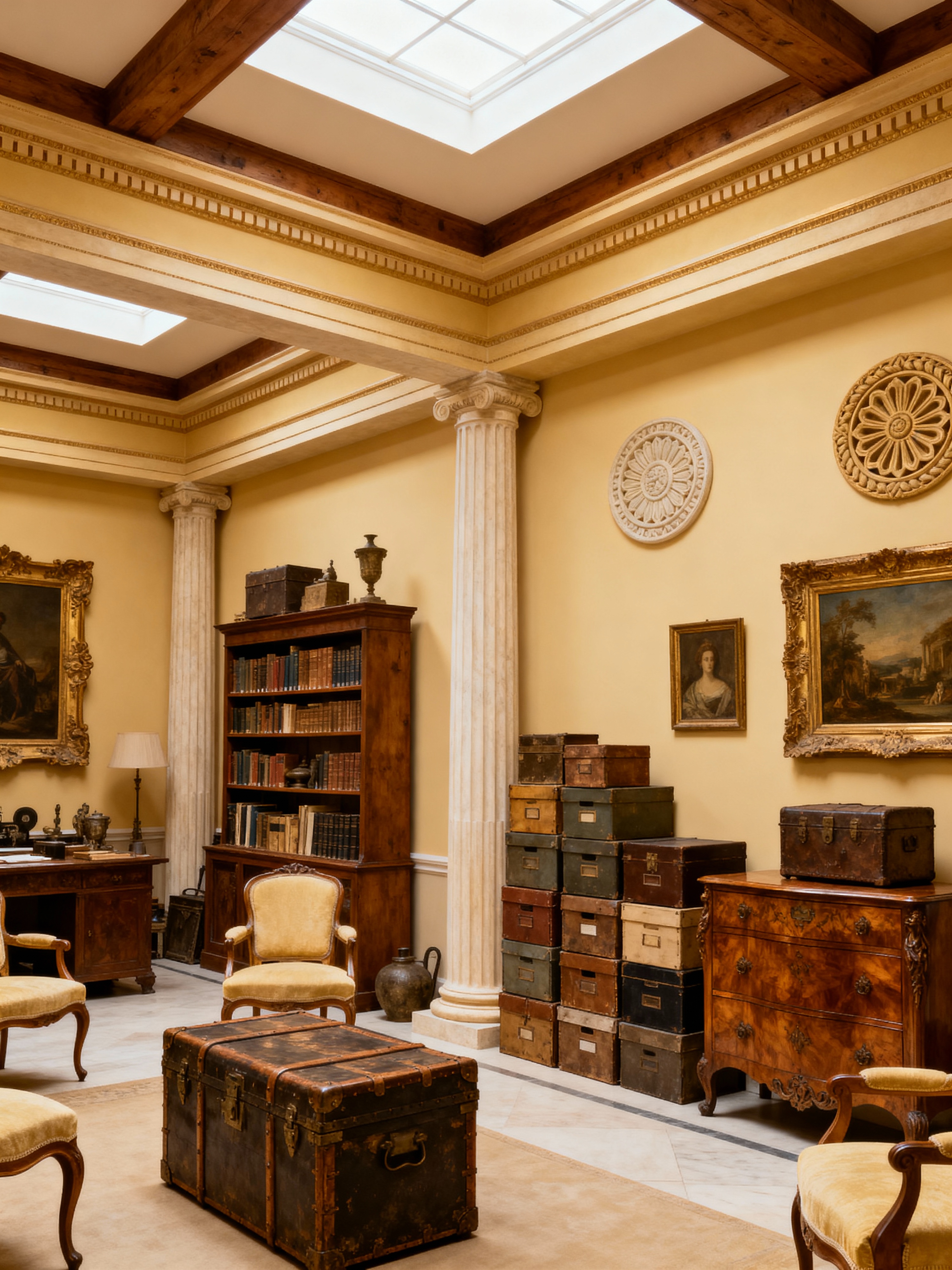 attic with neoclassic style with old furniture and exposed beams and old books and storage boxes and storage shelves and vintage trunk and antique items and skylights. . with classical architectural details and greek columns and high ceilings and emphasized horizontal and vertical lines and timeless artwork and spacious rooms and geometric decorative elements and timeless furniture
