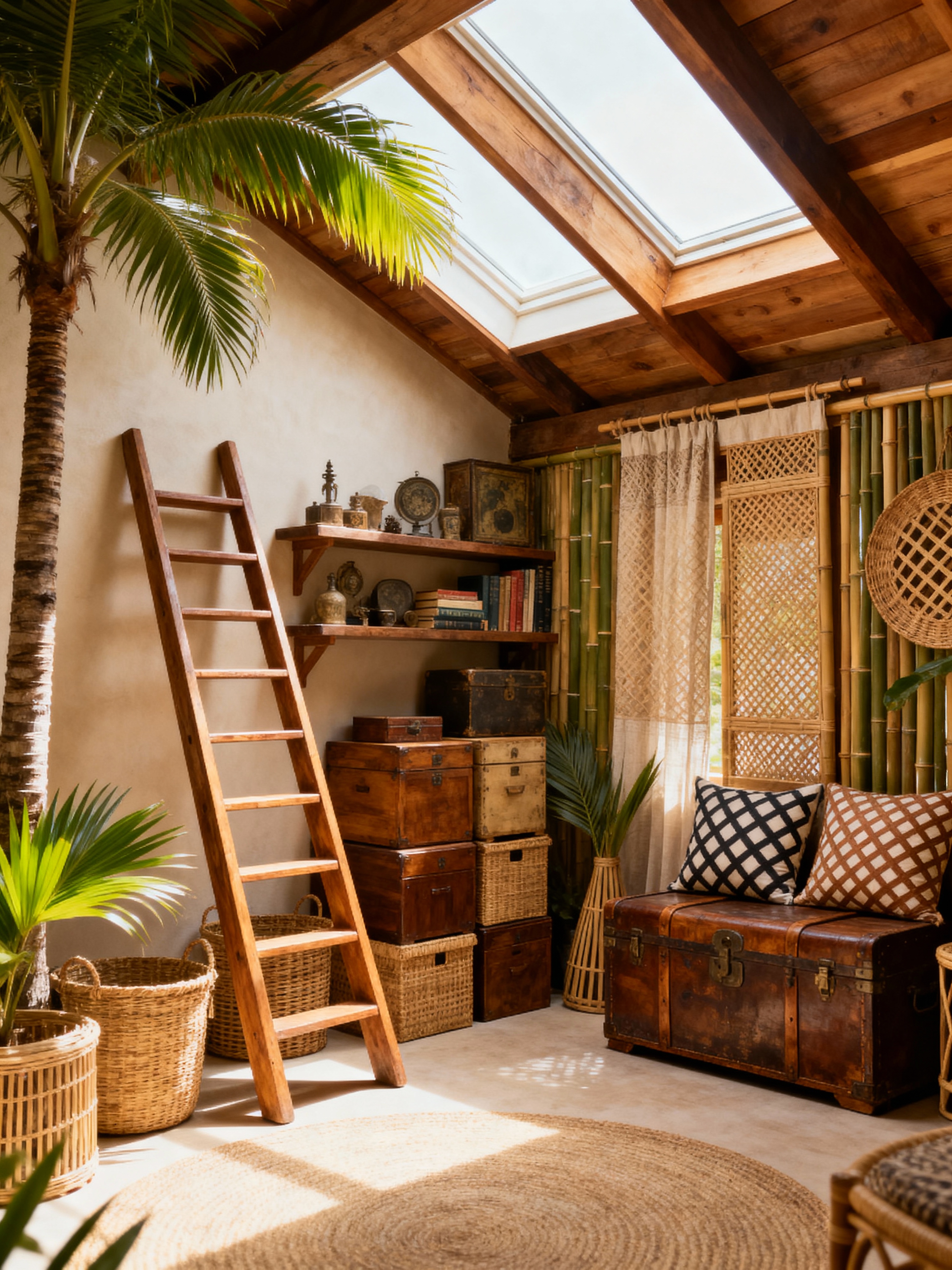 attic with tropical style with storage boxes and exposed beams and ladder and old furniture and vintage trunk and skylights and old books and antique items. . with palm trees and teak and wicker and palm leaves and bamboo and rattan and cane motifs and lattice prints