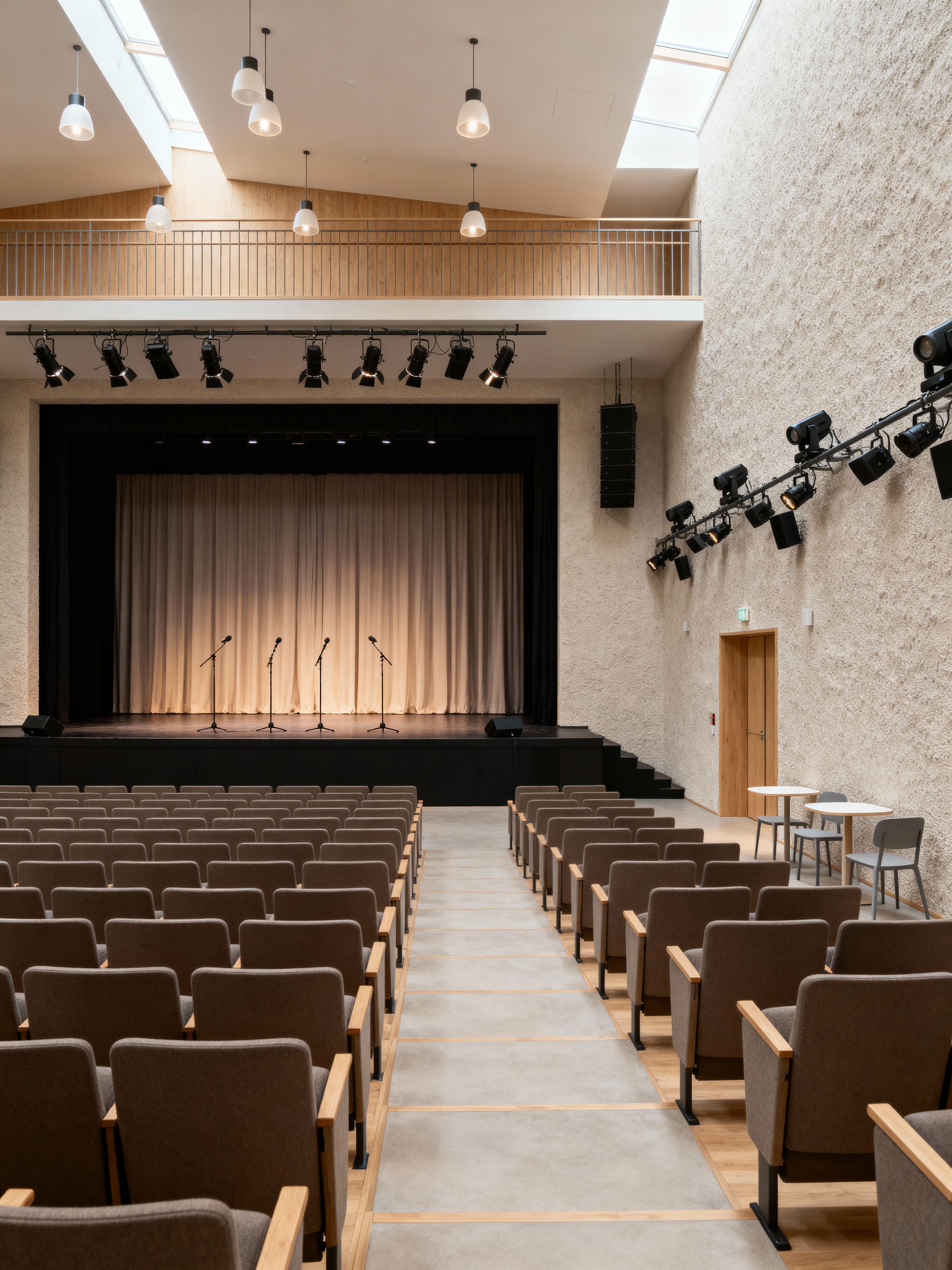 auditorium with airbnb style with aisles and lighting equipment and theater seats and microphones and balcony and stage and curtains and sound system. . with open and natural lighting and simple, clean lines and simplistic furniture and scandinavian style and simple color palette and practicality and functionality and natural materials and elements and neutral walls and textures and open and natural lighting
