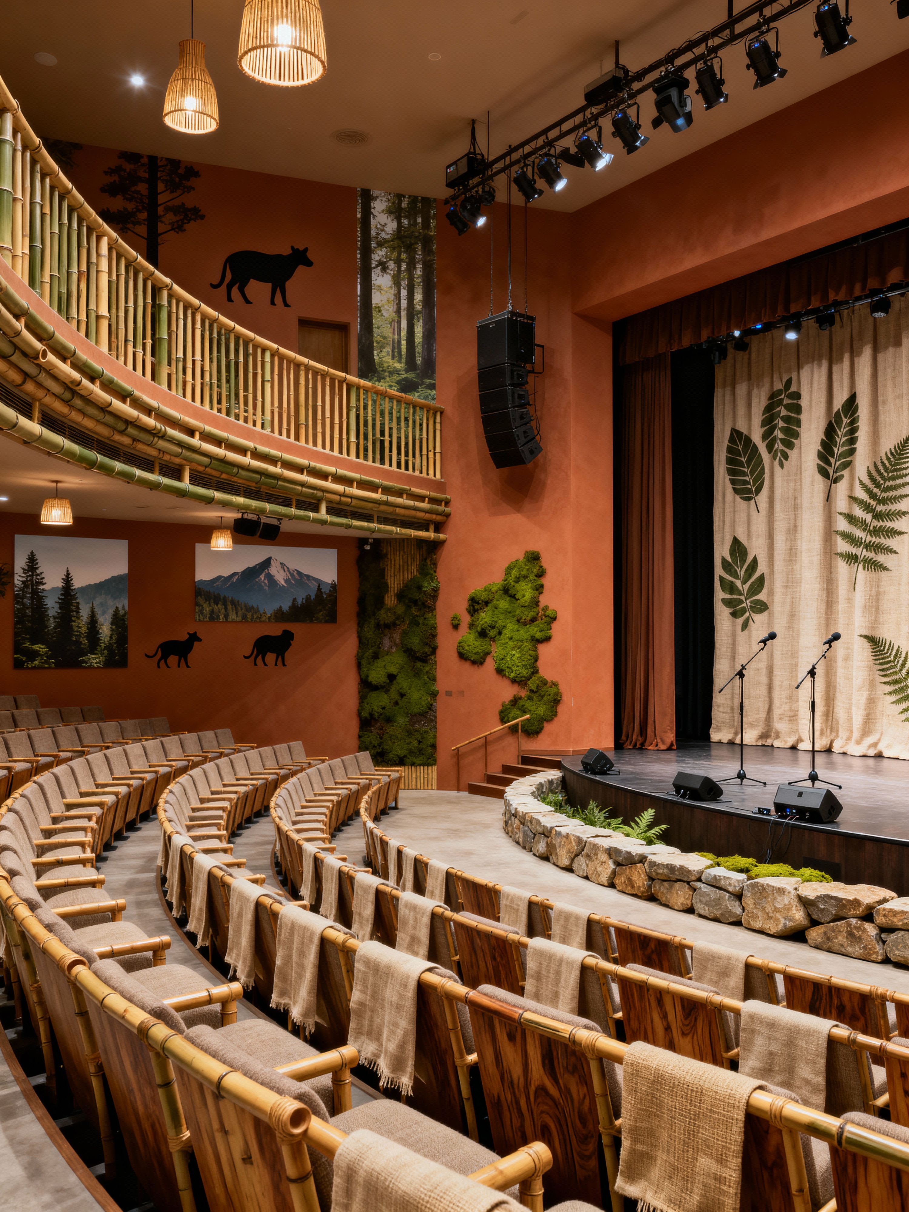 auditorium with biophilic style with balcony and aisles and microphones and curtains and sound system and lighting equipment and theater seats and orchestra pit. . with bamboo materials and images of nature and natural patterns and images of animals and environmental features and earthy colors and calming style and linen materials