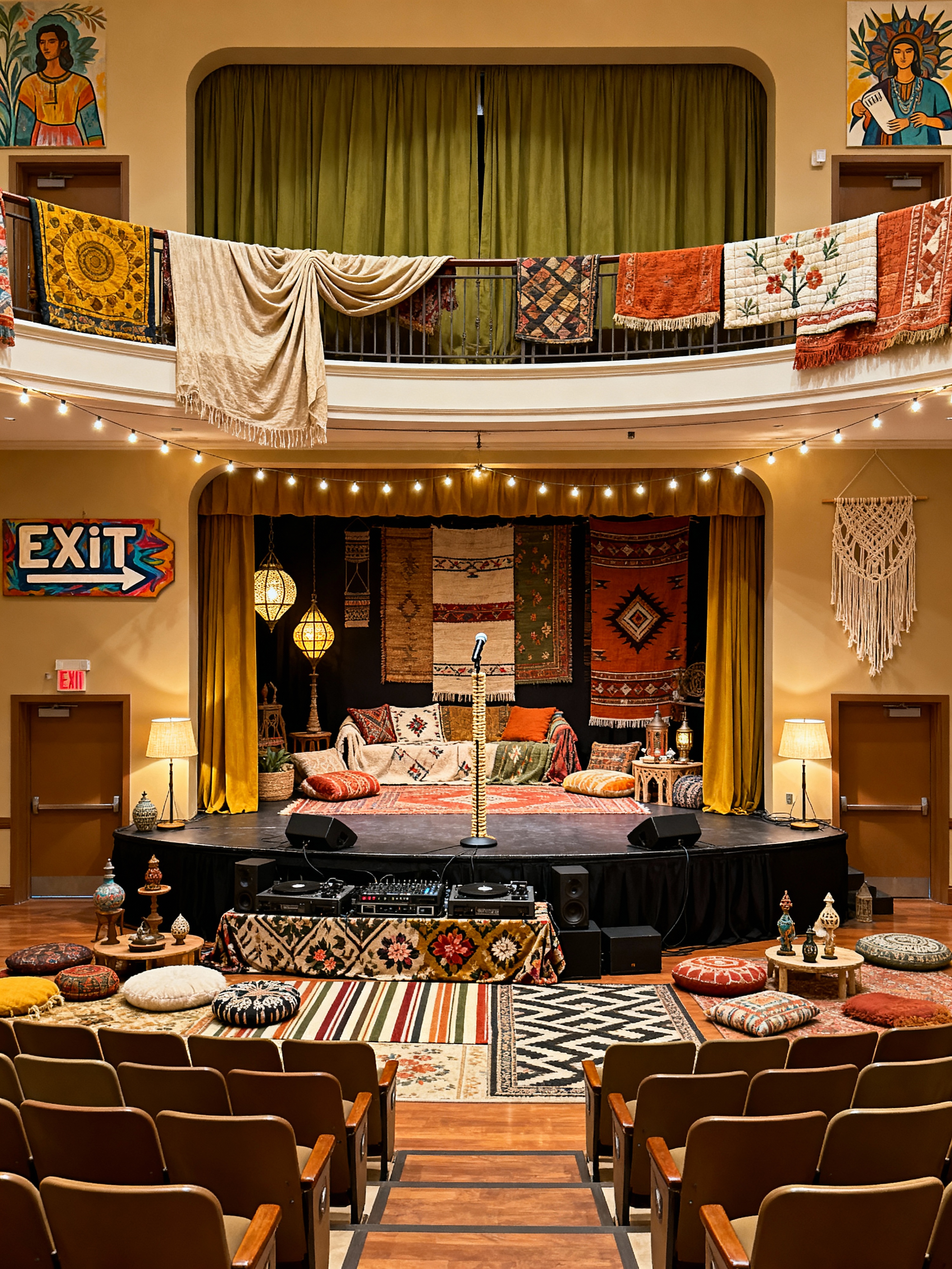 auditorium with boho-chic style with balcony and curtains and microphones and exit signs and aisles and stage and sound system and orchestra pit. . with earthy colors and artistic touches and free-spirited and layered textiles and global artifacts and eclectic mix and bohemian flair and mixed patterns