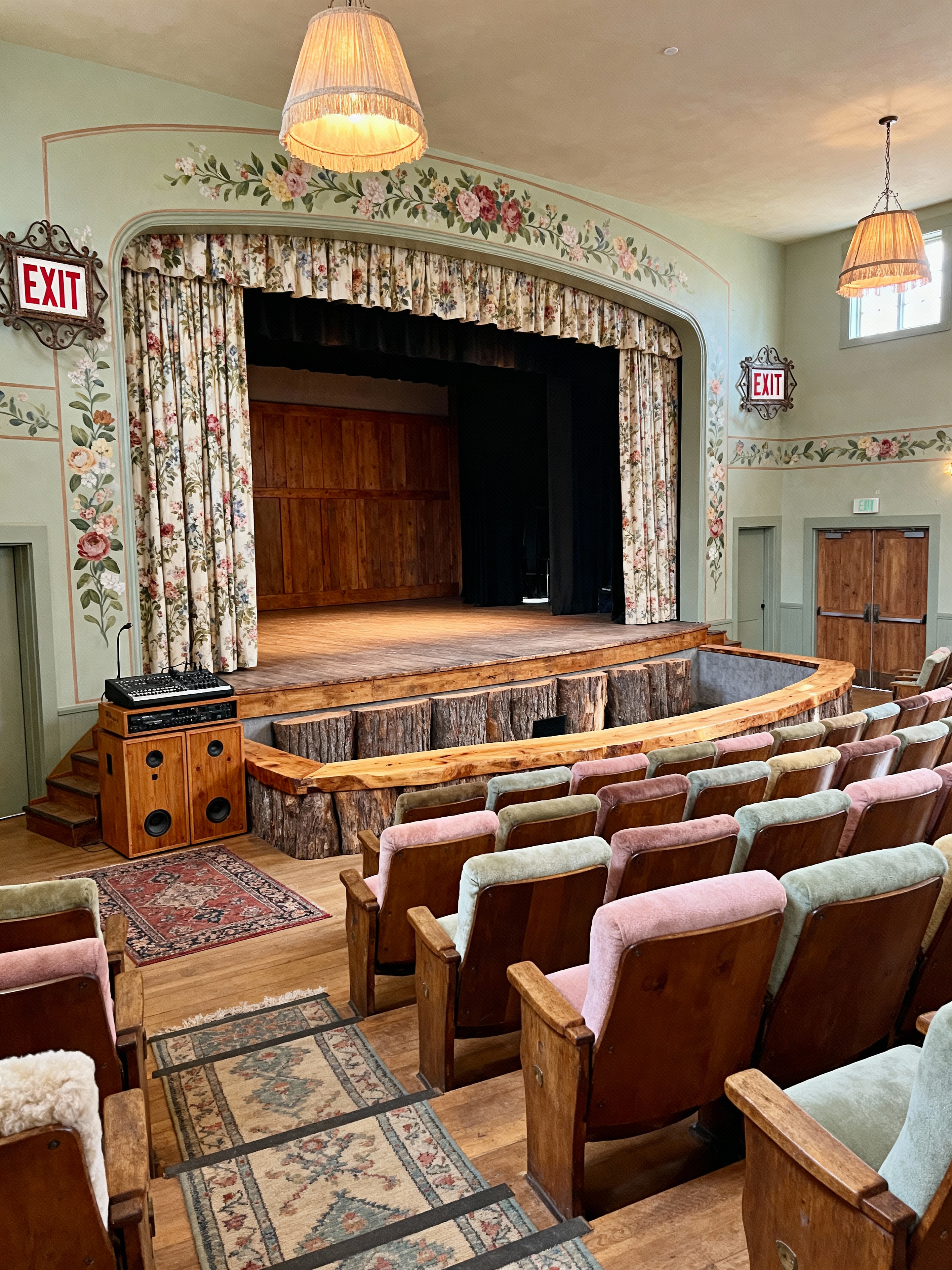 auditorium with cottagecore style with curtains and theater seats and orchestra pit and stage and exit signs and lighting equipment and sound system and aisles. . with muted colors and rustic and cottage style and earthy and organic and floral patterns and traditional and country style