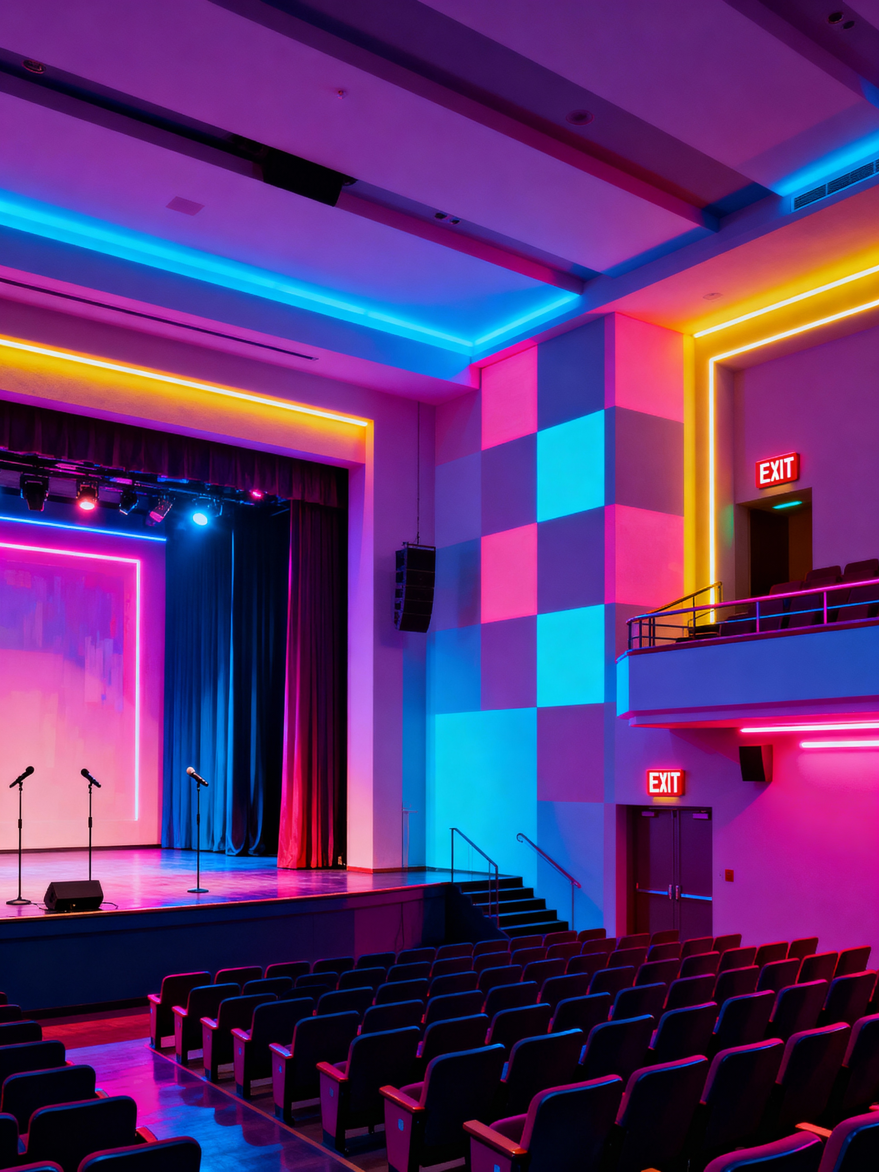 auditorium with cyberpunk style with lighting equipment and stage and theater seats and aisles and microphones and curtains and exit signs and balcony. . with color lights glow and synthetic objects and cyberpunk lights and futuristic cybernetic city and strong geometric walls and clean straight square lines and synthwave and surrealist paintings