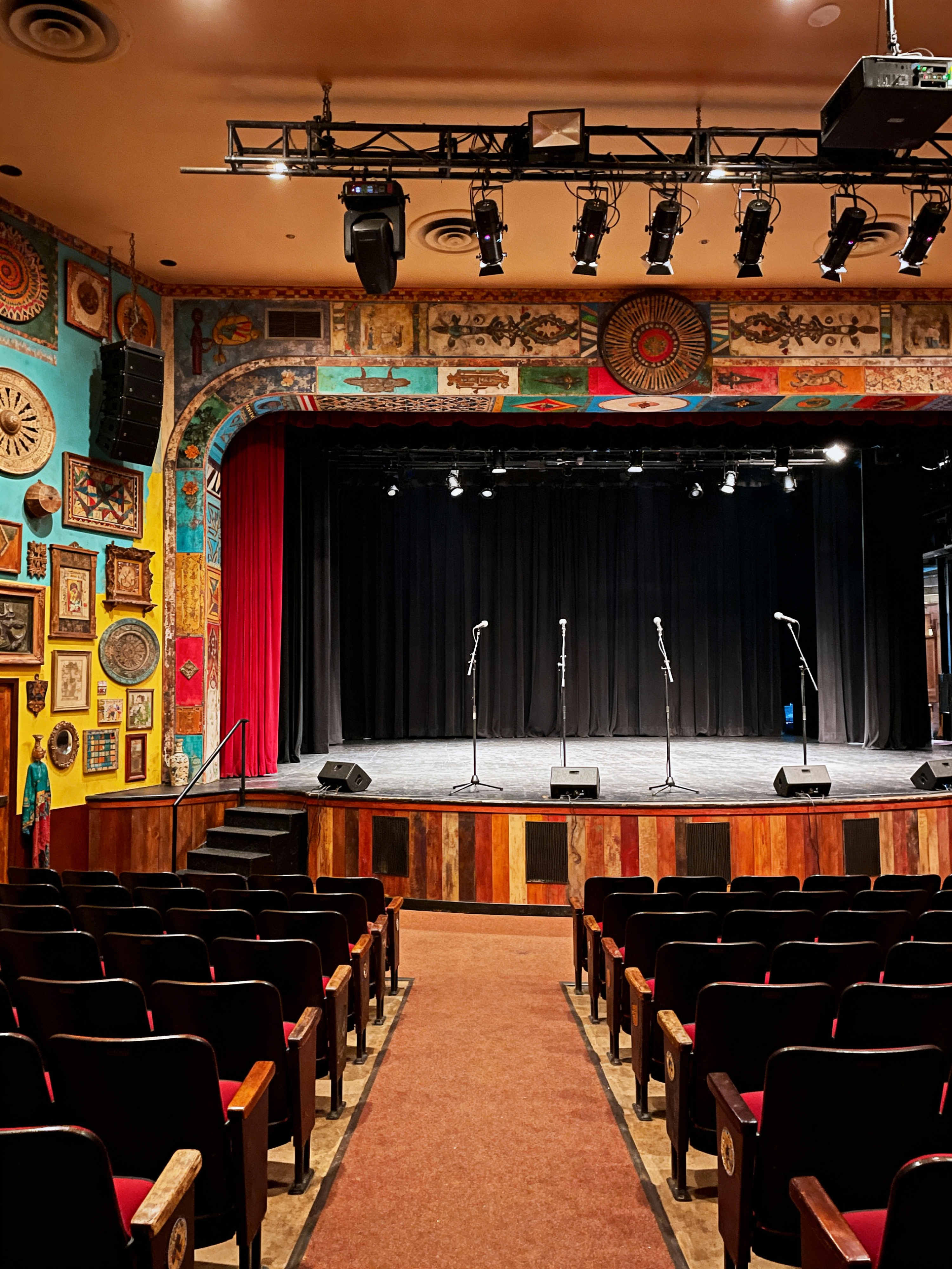 auditorium with eclectic style with sound system and orchestra pit and theater seats and curtains and stage and lighting equipment and microphones and aisles. . with vintage finds and colorful palette and personal expression and unexpected elements and mixed styles and global influences and creative freedom and artistic flair