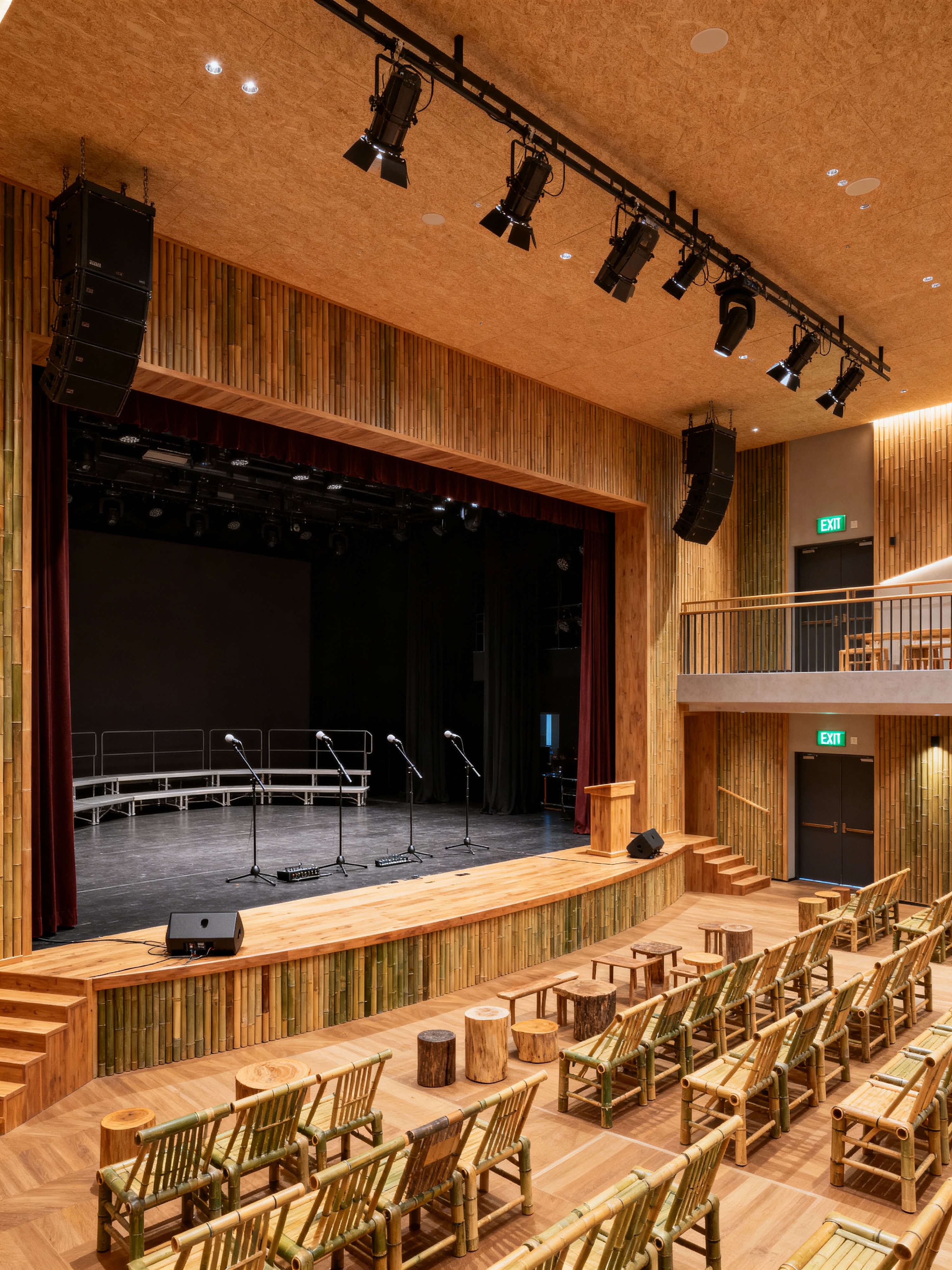 auditorium with eco-friendly style with stage and microphones and orchestra pit and sound system and balcony and lighting equipment and exit signs and curtains. . with non-toxic finishes and bamboo furniture and recycled elements and reclaimed wood and environmentally conscious and organic textiles and sustainable materials and energy efficient