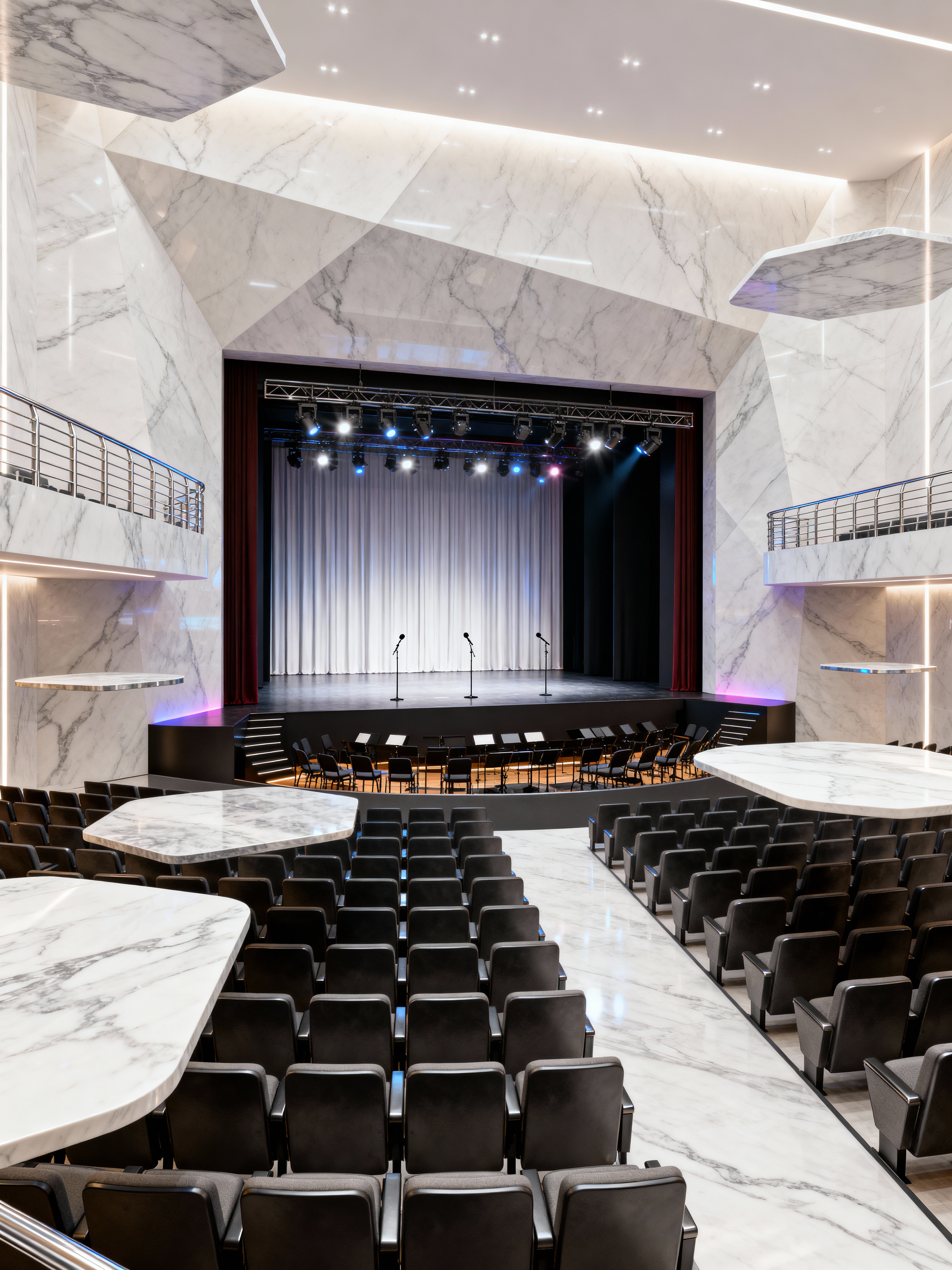 auditorium with futuristic style with theater seats and stage and lighting equipment and orchestra pit and balcony and curtains and microphones and aisles. . with smooth polished marble and neutral background and bright accents and futuristic interior and strong geometric walls and smooth marble and minimalist clean lines and floating surfaces and steel finishing