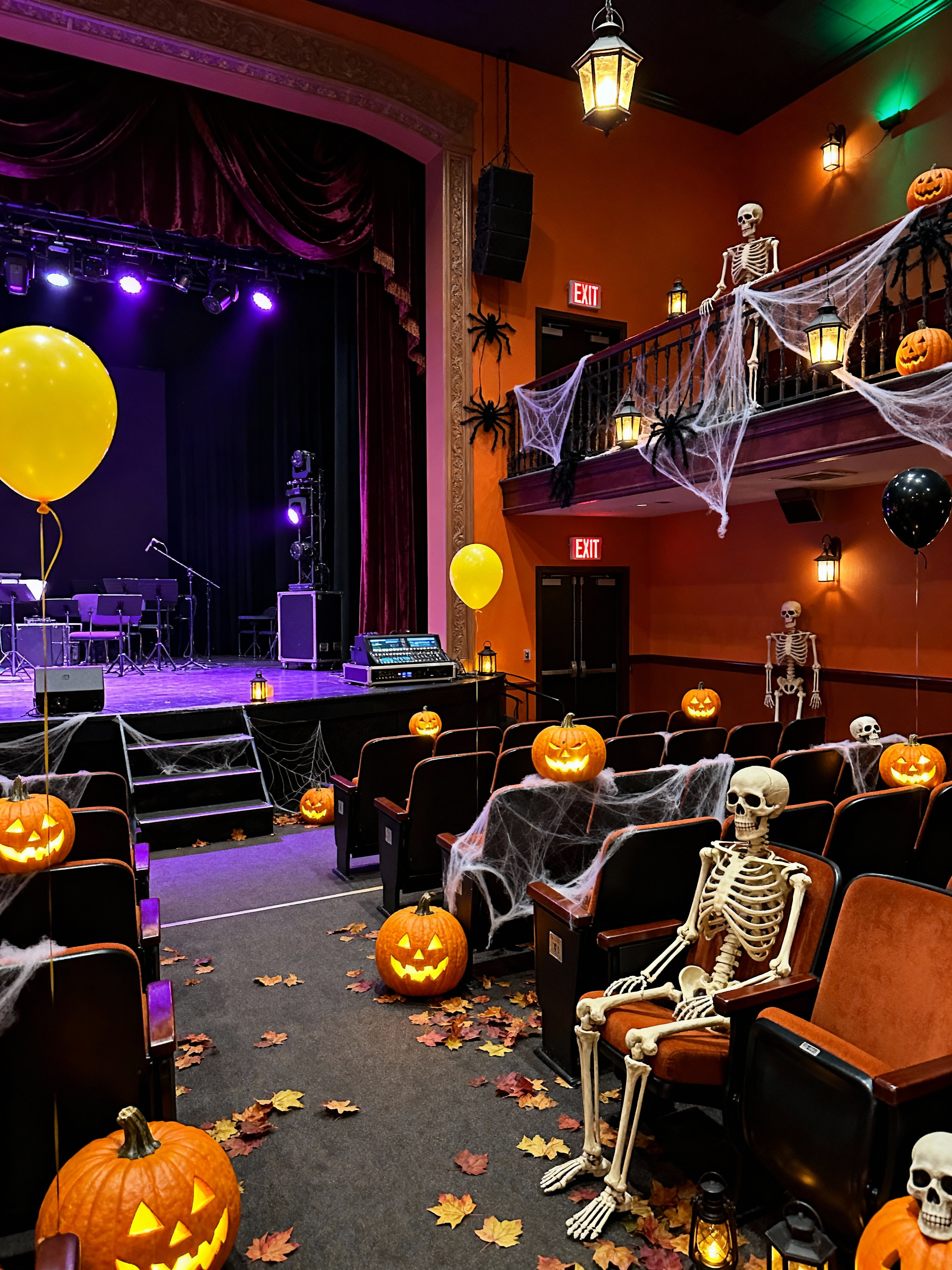 auditorium with halloween style with exit signs and curtains and theater seats and orchestra pit and lighting equipment and sound system and aisles and balcony. . with glowing pumpkins and yellow black balloons and spiderwebs and lanterns and human skulls and skeletons sitting and standing and cobwebs and lanterns