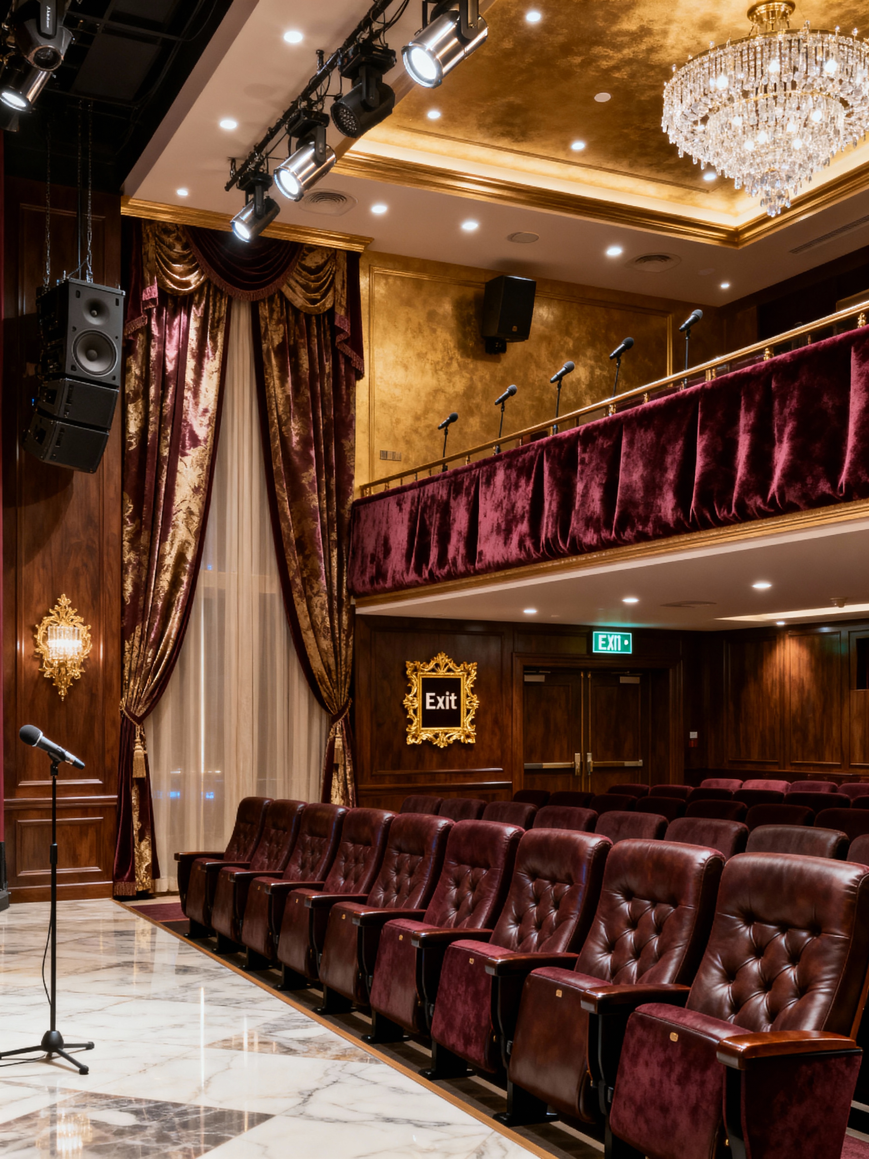 auditorium with luxury style with balcony and microphones and sound system and lighting equipment and curtains and theater seats and aisles and exit signs. . with elegant lighting and exclusive design and lavish comfort and designer furniture and rich textures and custom pieces and opulent details and expensive fabrics