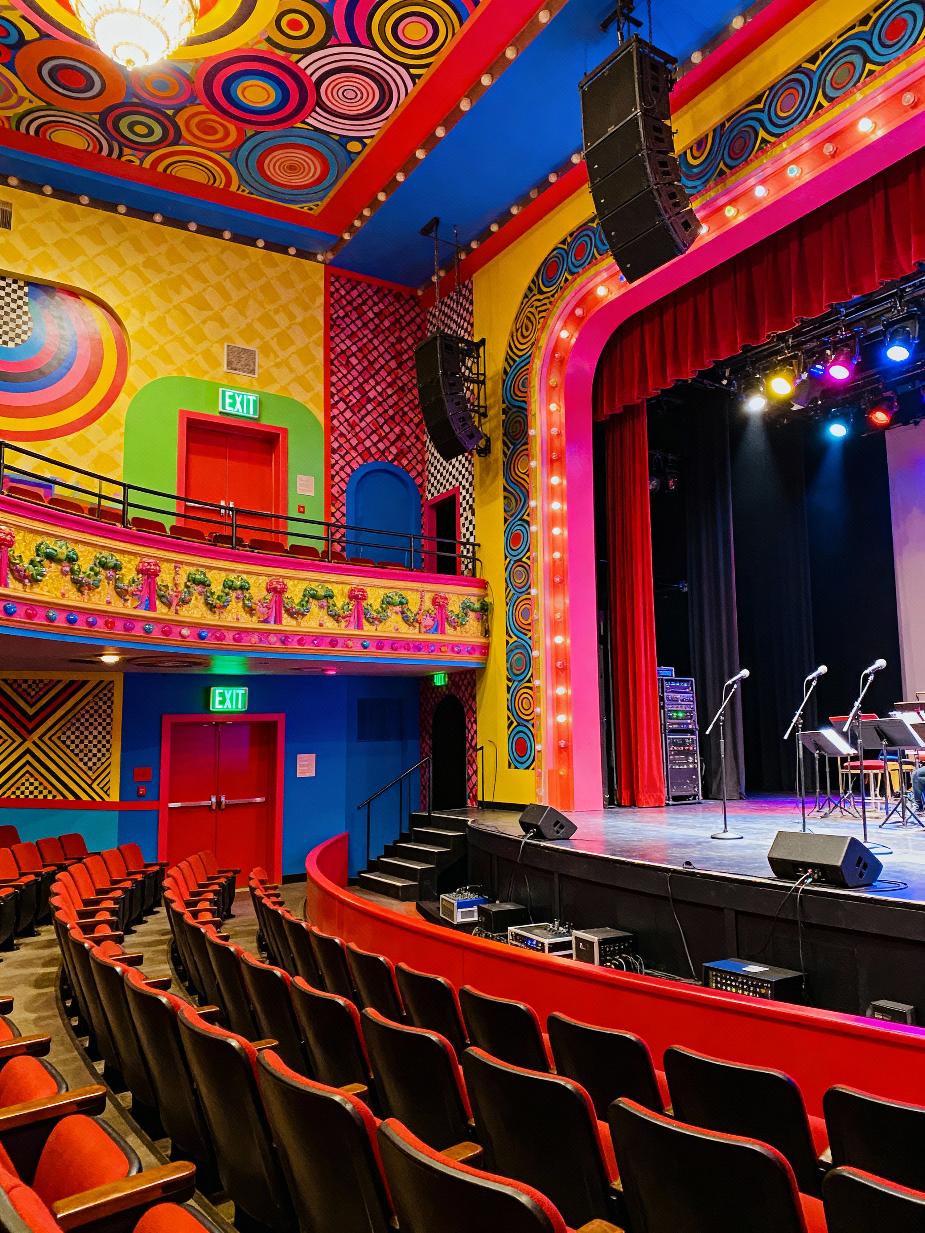 auditorium with maximalist style with balcony and theater seats and exit signs and orchestra pit and stage and lighting equipment and microphones and sound system. . with bold creativity and more is more philosophy and bold patterns and bold colors and vibrant and playful and over-the-top aesthetic and eye-catching